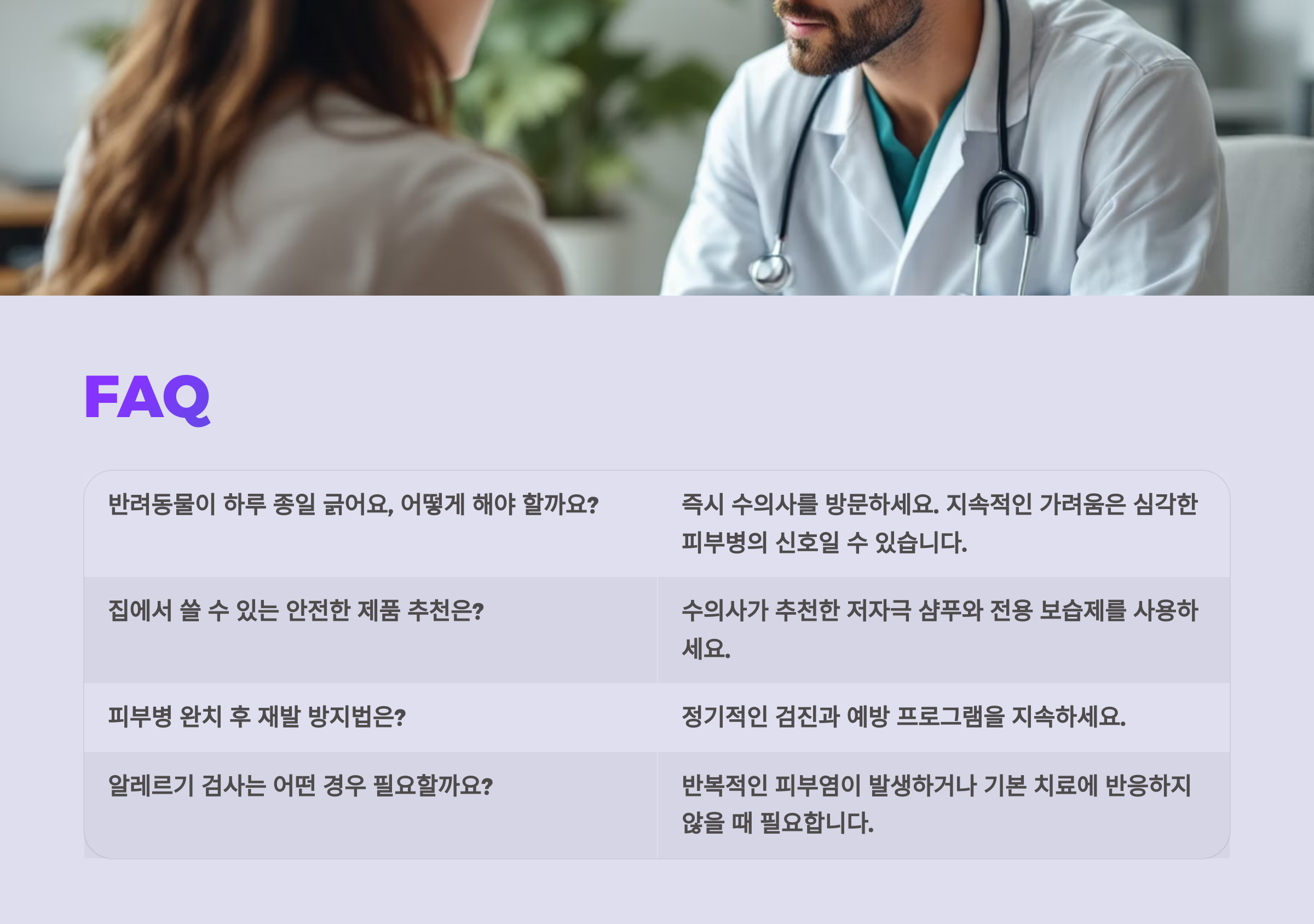 📌 다음은 보호자분들이 가장 많이 궁금해하는 피부병 관련 실전 FAQ예요! 병원 가기 전에 꼭 알고 있어야 할 꿀팁까지 알려줄게요 🐶🐱