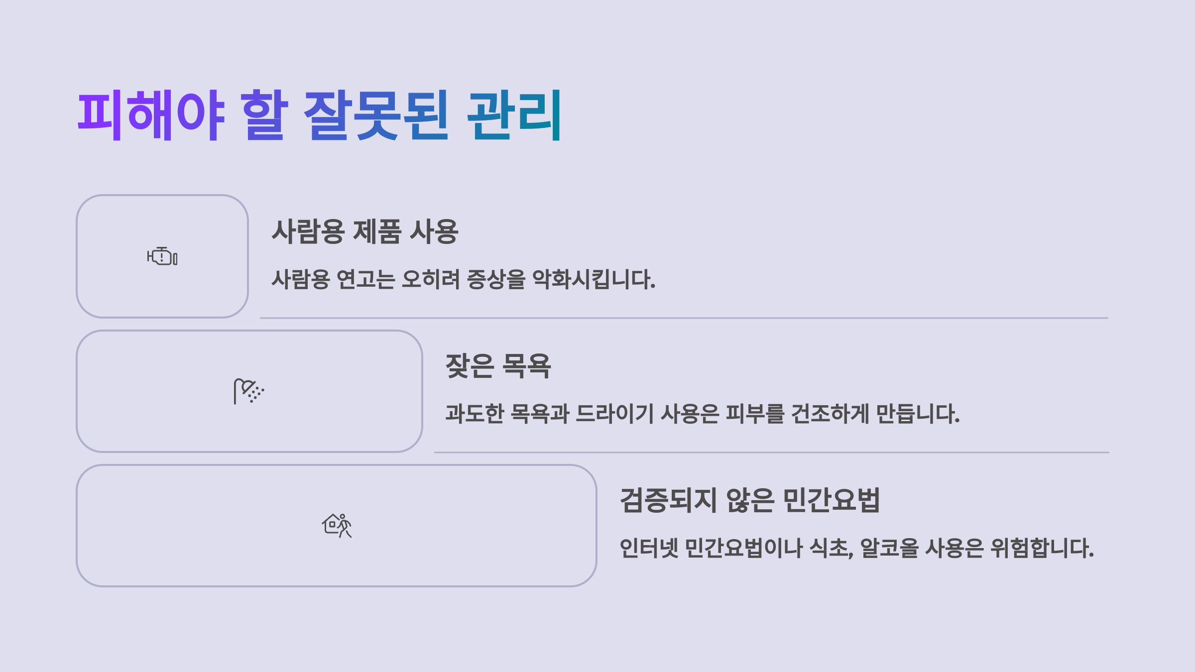 🚫 다음 섹션에서는 오히려 병을 키우는 잘못된 관리법에 대해 알아볼게요. 좋은 의도로 시작한 케어가 독이 될 수 있어요!
