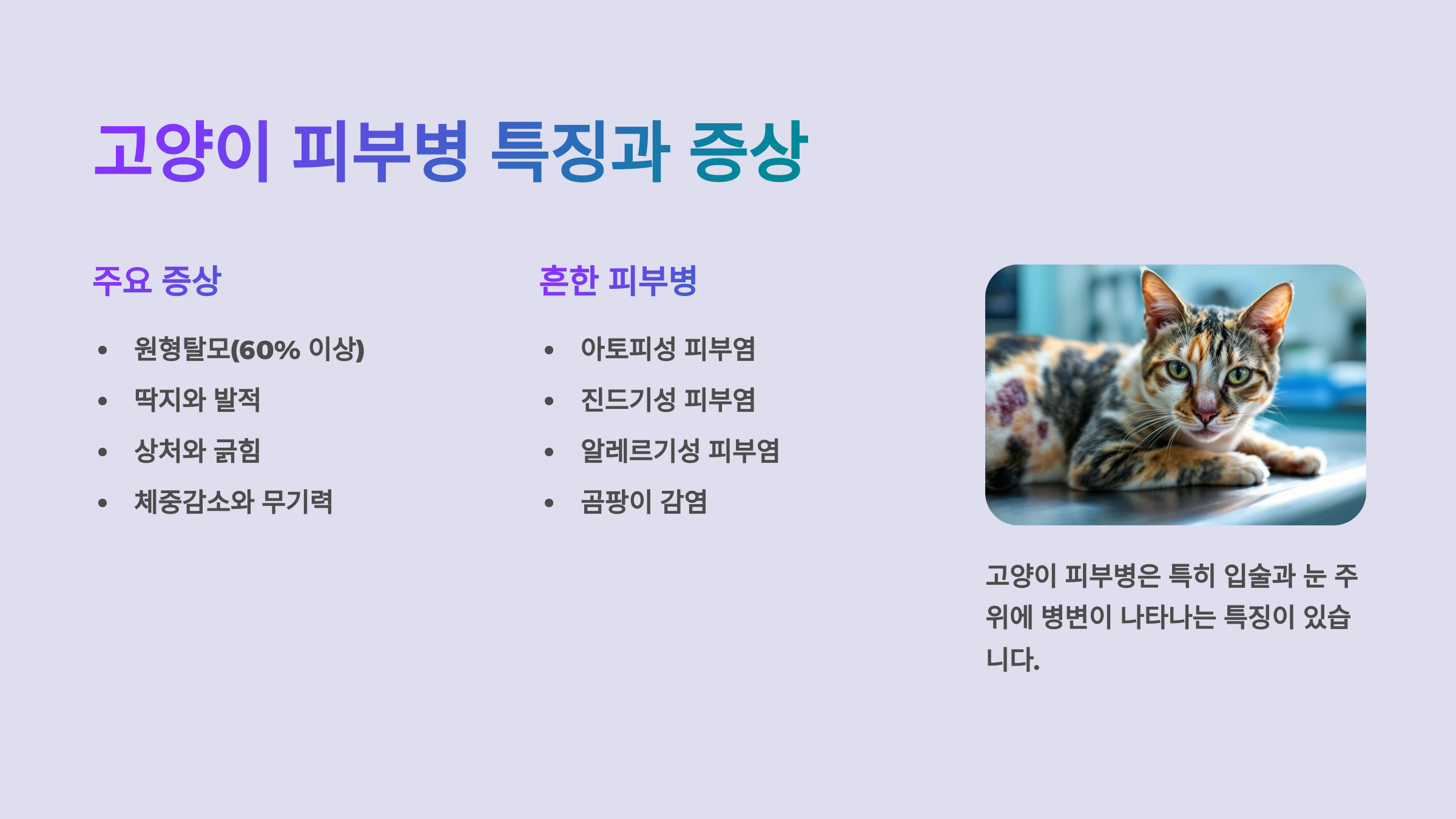 📌 다음은 고양이 집사님들을 위한 정보! 고양이 피부병의 주요 특징과 증상에 대해 살펴볼게요. 강아지와는 조금 다른 점이 많답니다 🐱