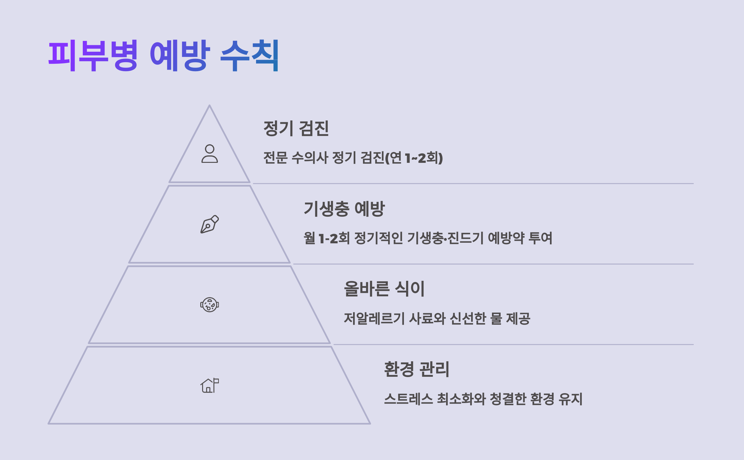 🛡️ 반려동물의 피부병은 한번 생기면 치료 기간이 길고 재발 가능성도 높기 때문에, 애초에 생기지 않도록 생활 속에서 예방하는 습관이 정말 중요해요!