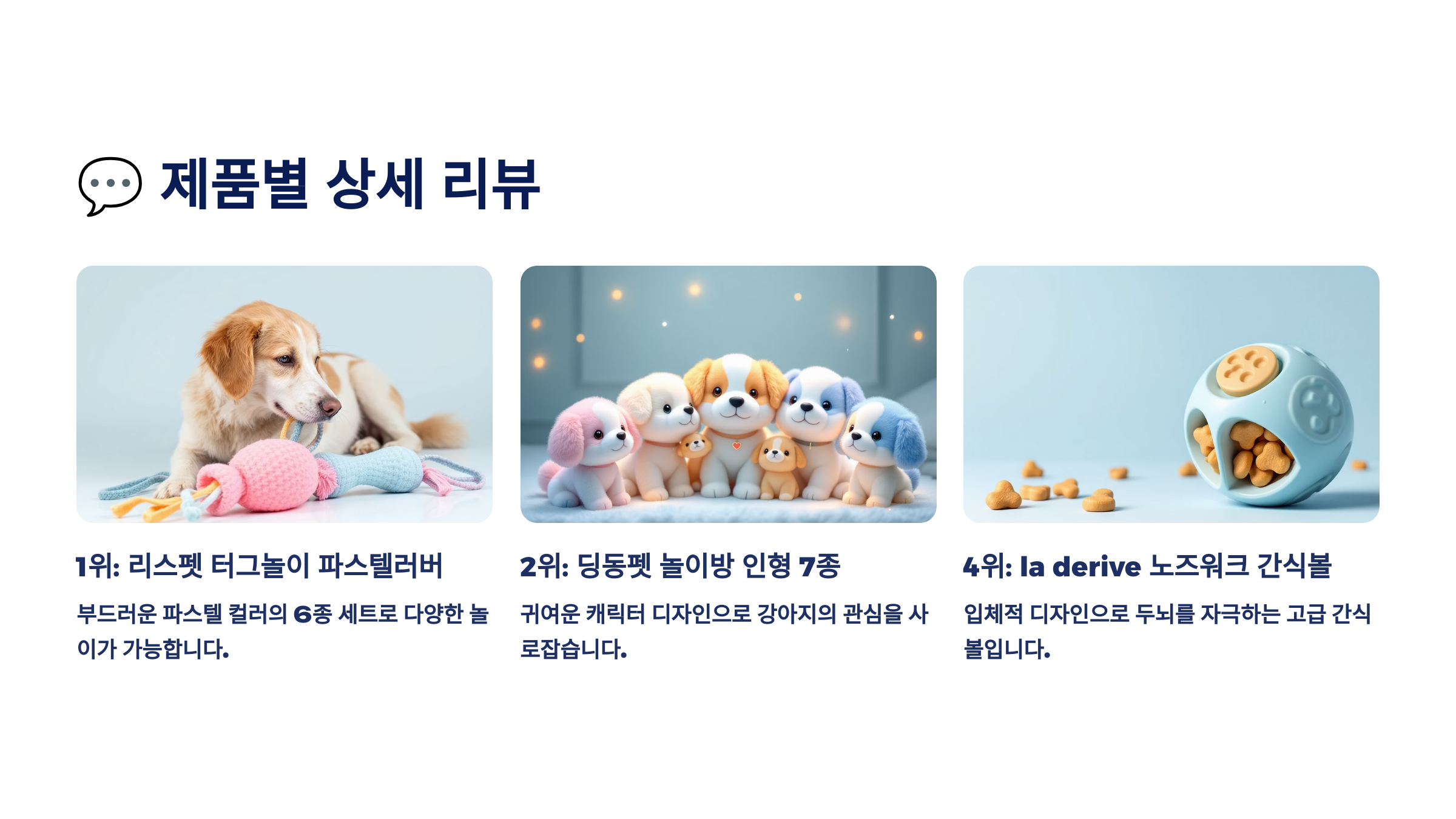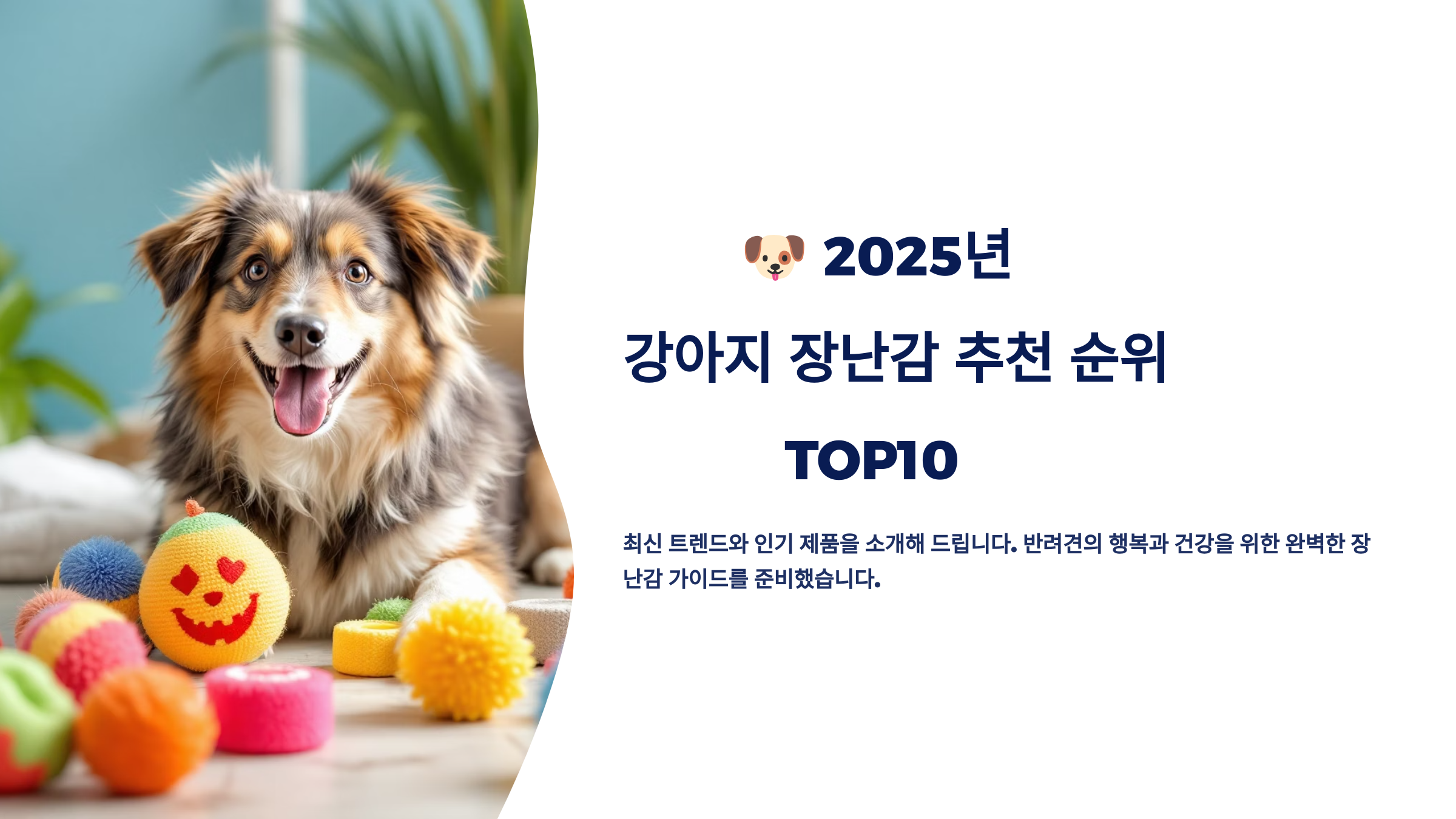 이제 장난감 종류를 알았으니, 다음은 🎯 2025년 강아지 장난감 TOP10 소개로 넘어가서 올해 가장 핫한 제품들을 만나보자!