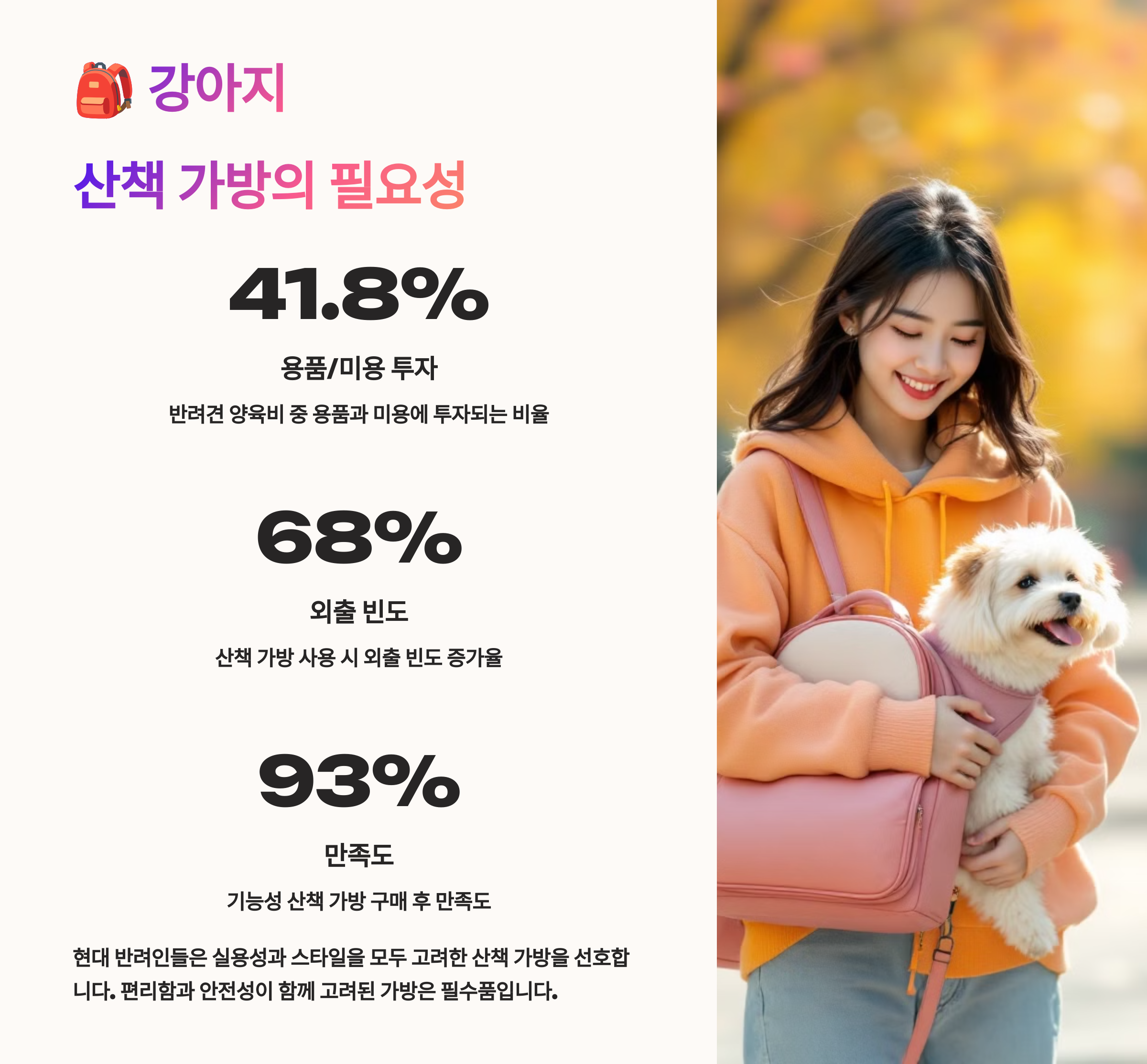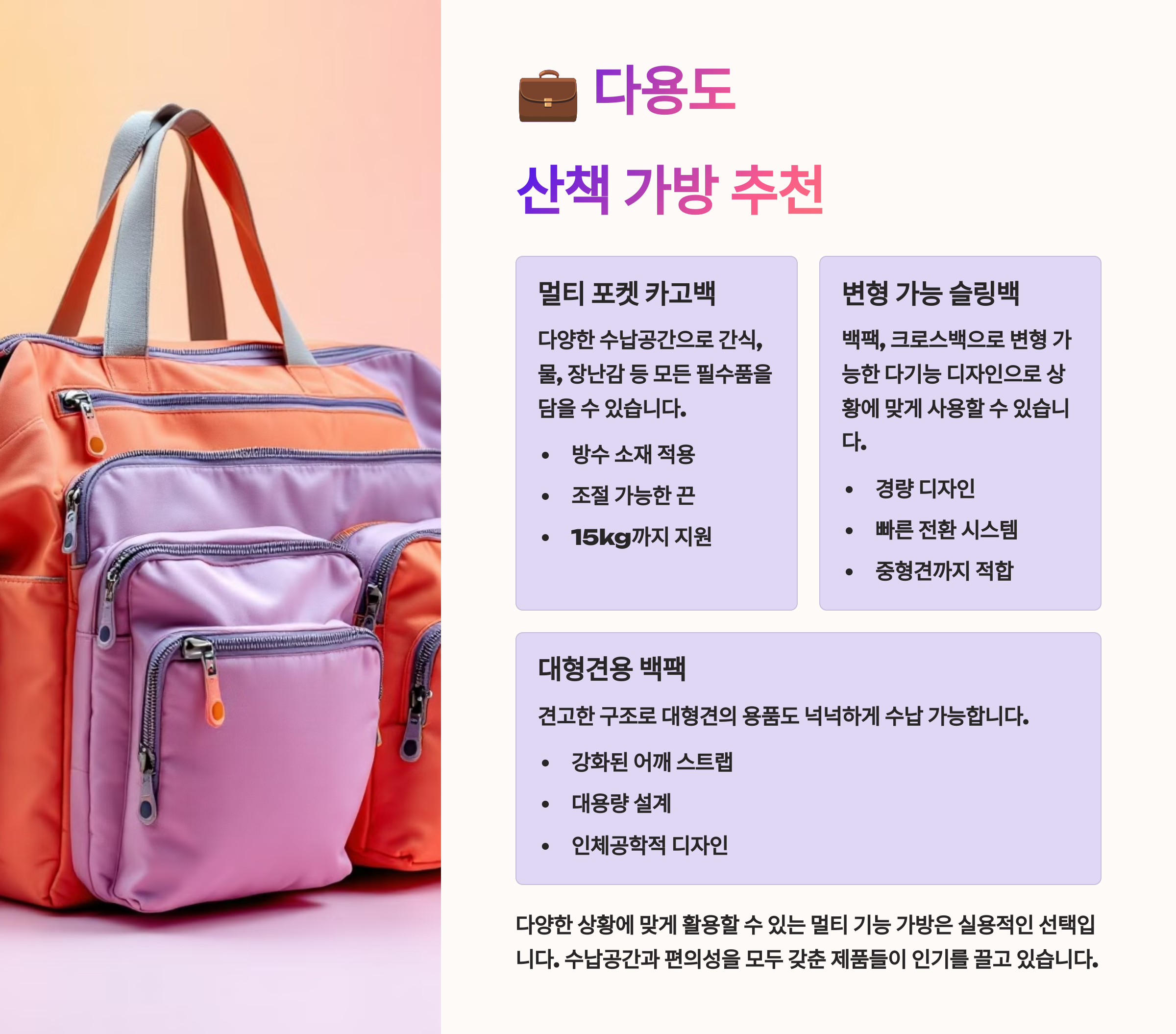 👟 강아지 산책은 매일의 일상이고, 자주 반복되는 행동인 만큼 이걸 조금 더 스마트하게 해주는 아이템 하나쯤은 갖추면 확실히 삶의 질이 달라져요. 산책 가방은 바로 그런 ‘생활의 질템’이 되는 거예요!