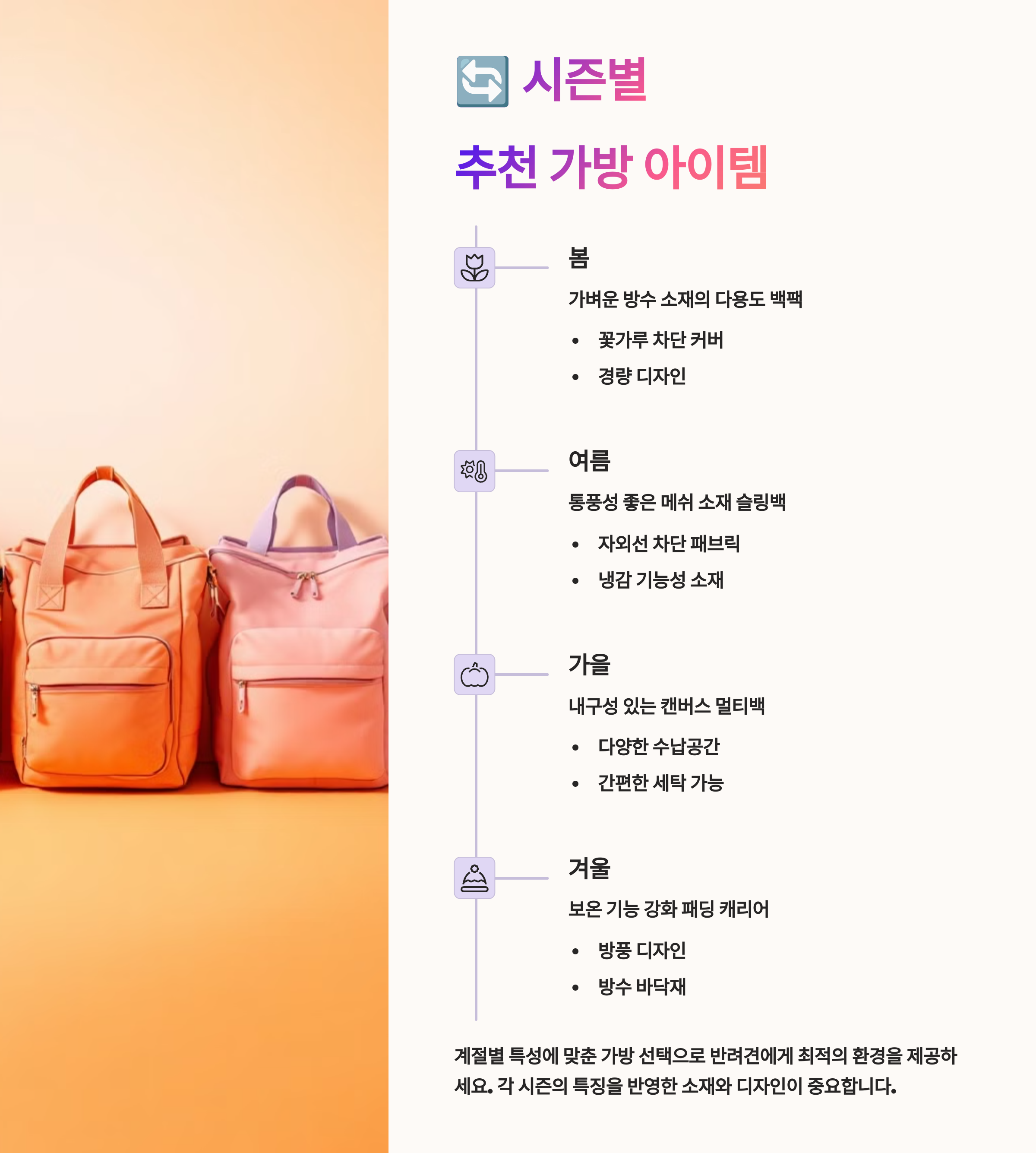 🌦️ 다음은 계절에 맞는 가방 추천! 여름엔 통기성, 겨울엔 보온성! 시즌별 추천 가방 아이템도 꼭 봐야겠죠? 🔄🌸❄️