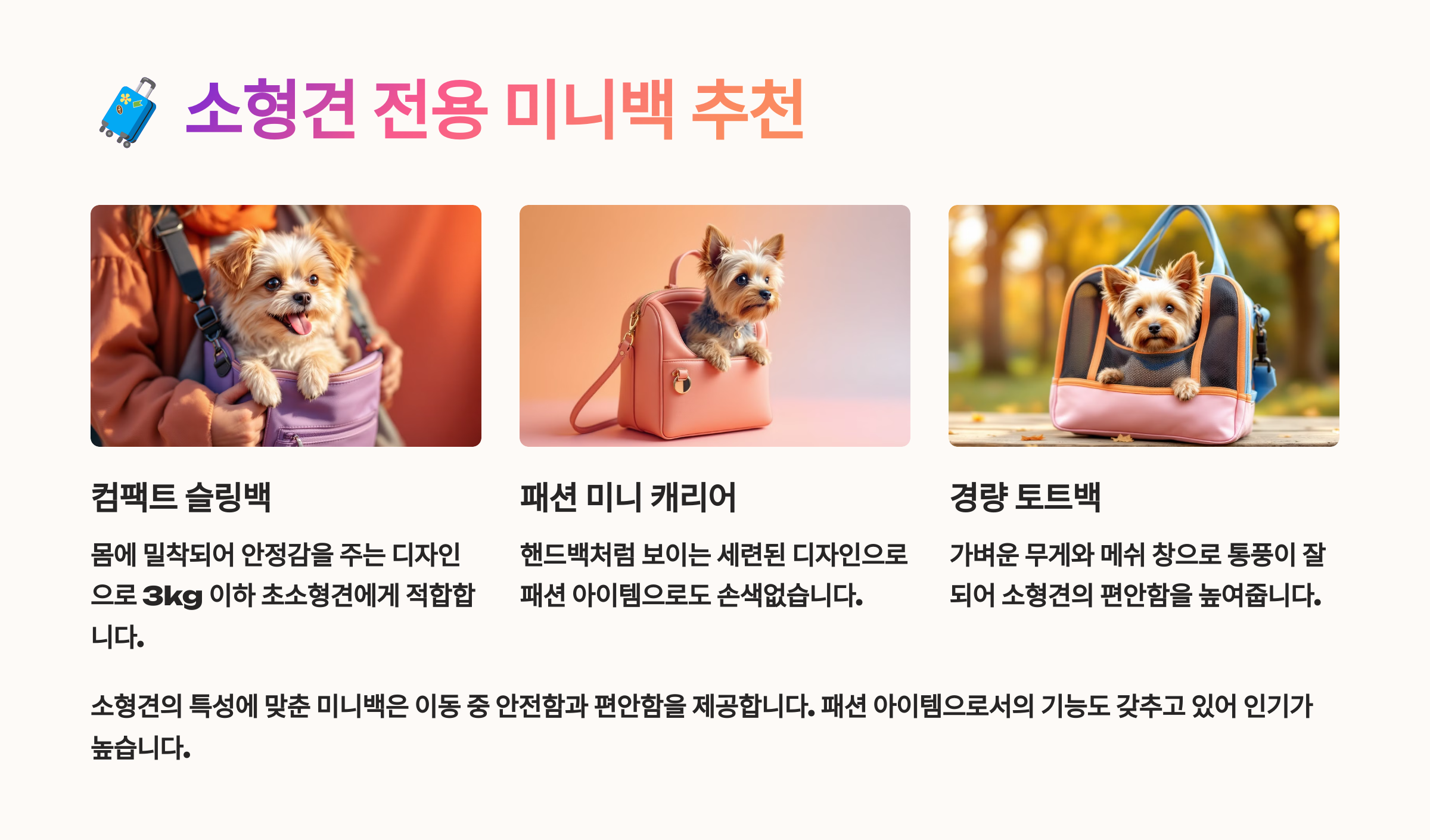 👗 다음은 소형견 보호자를 위한 미니멀 사이즈! 소형견 전용 미니백 추천 섹션으로 가보자~ 귀염뽀짝 가방들로 준비했지! 🧳🐕
