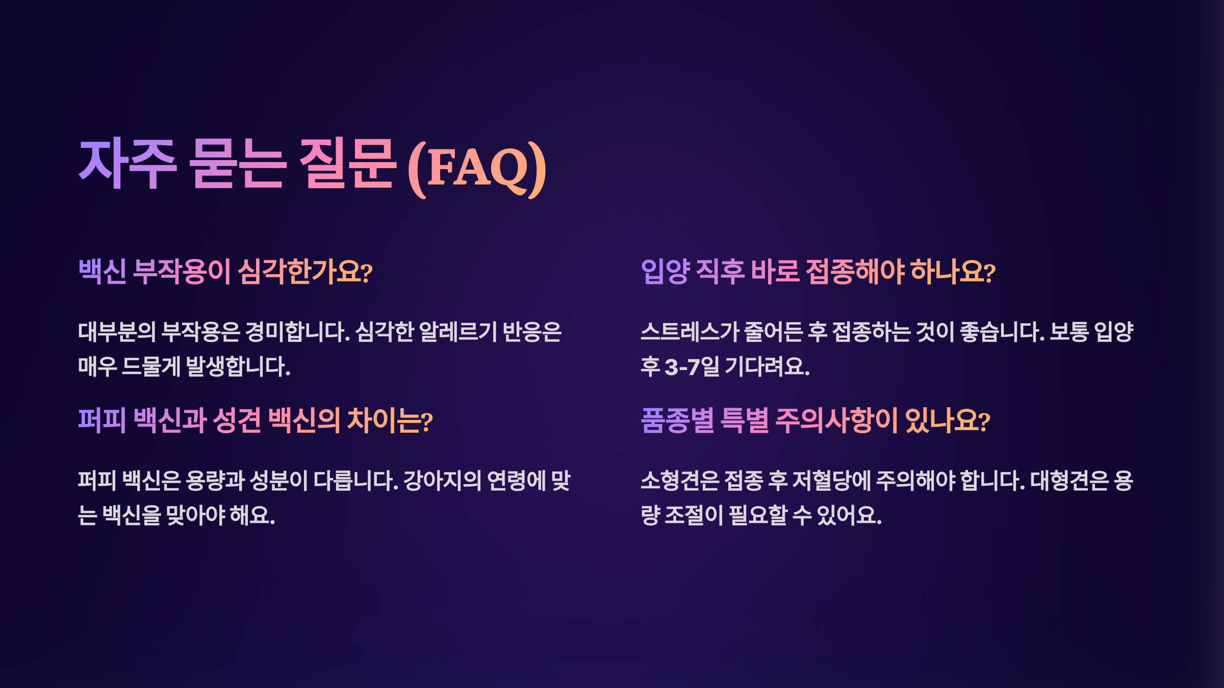 💡 예방접종은 무조건 맞아야 하되, 접종 당일에는 무리한 활동 없이 조용히 보내게 해주는 게 보호자로서 할 수 있는 최고의 배려랍니다 🐶