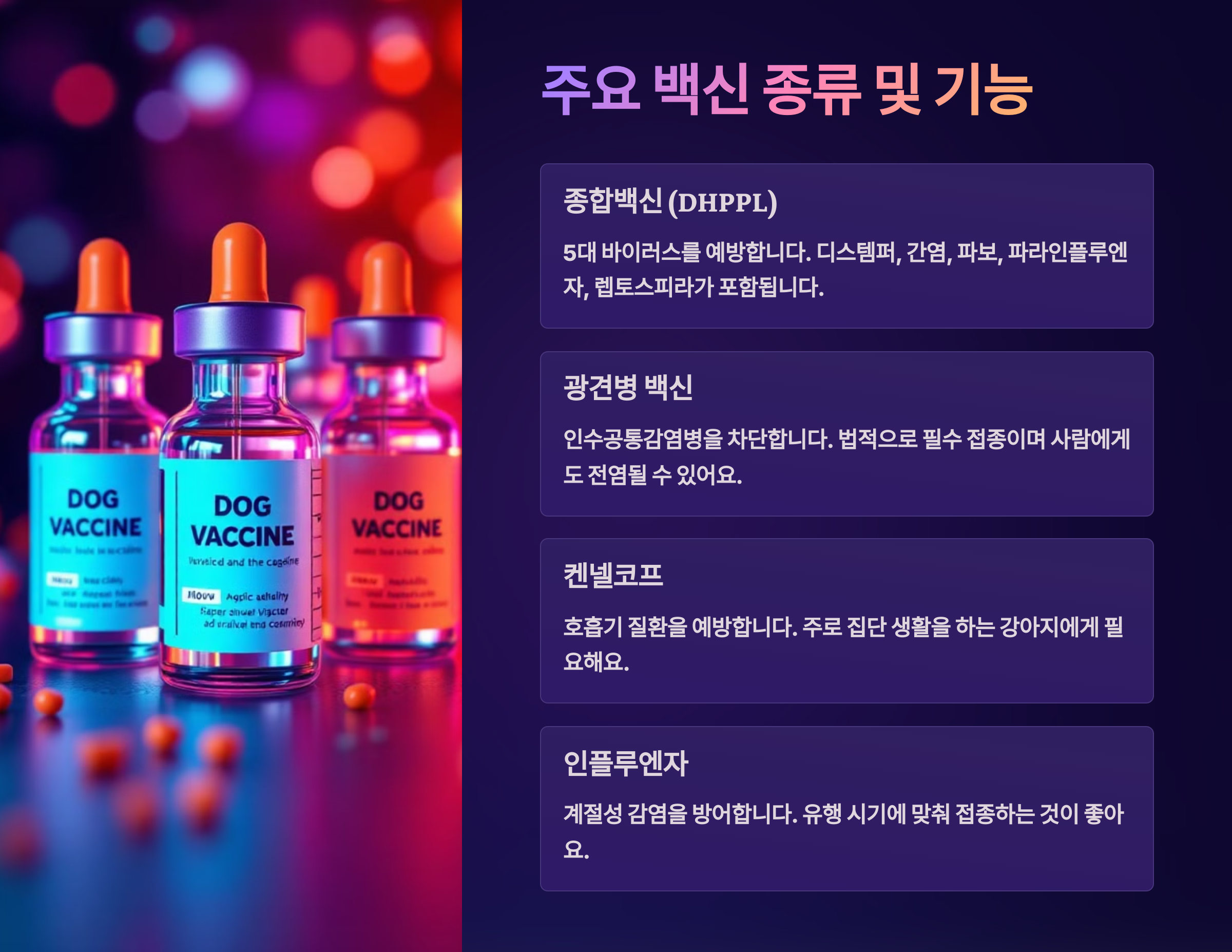 📌 강아지 예방접종은 단순히 한 번에 하나씩 맞는 게 아니라, 혼합백신(5종·6종·7종) 형태로 접종돼요. 각 혼합백신은 여러 질병을 동시에 예방할 수 있도록 구성돼 있어서 매우 효율적이에요.