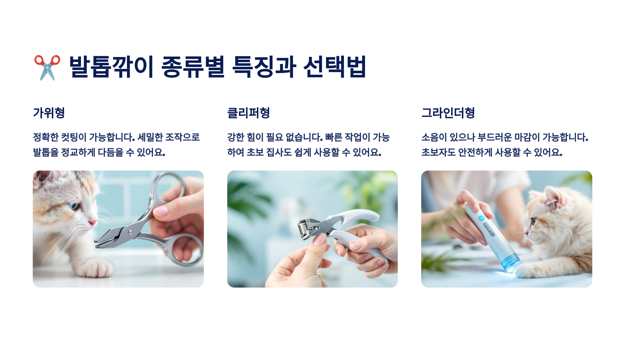 다음은 고양이 발톱깎이의 종류별 특징과 우리 냥이에게 딱 맞는 선택법을 알아볼 차례예요! 두 번째 섹션으로 넘어가볼까요? ✂️🐈