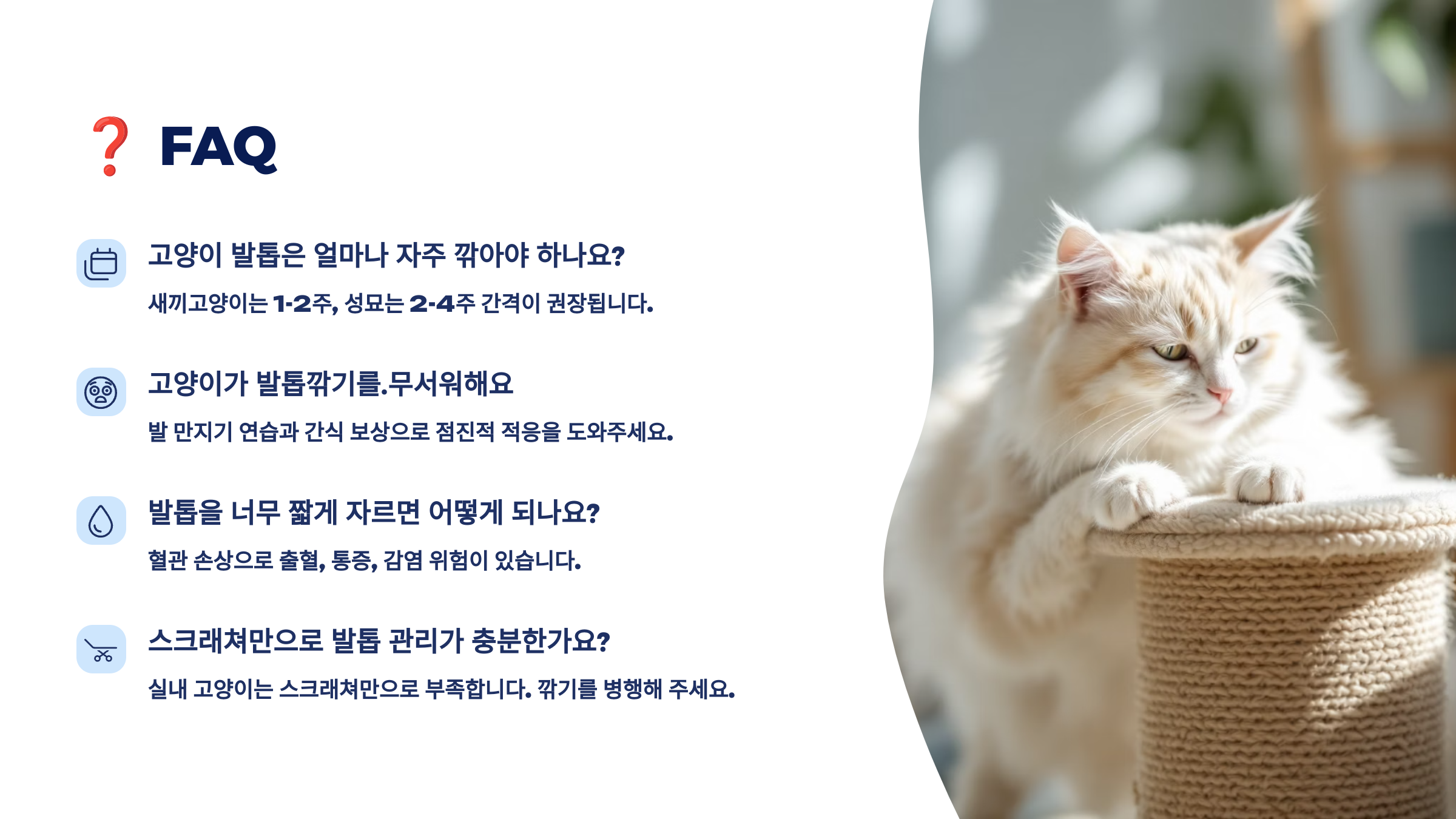 A6. 네, 아기 고양이일수록 발톱이 날카롭고 위험해요. 단, 작은 전용 가위나 곡선형을 써야 안전해요.