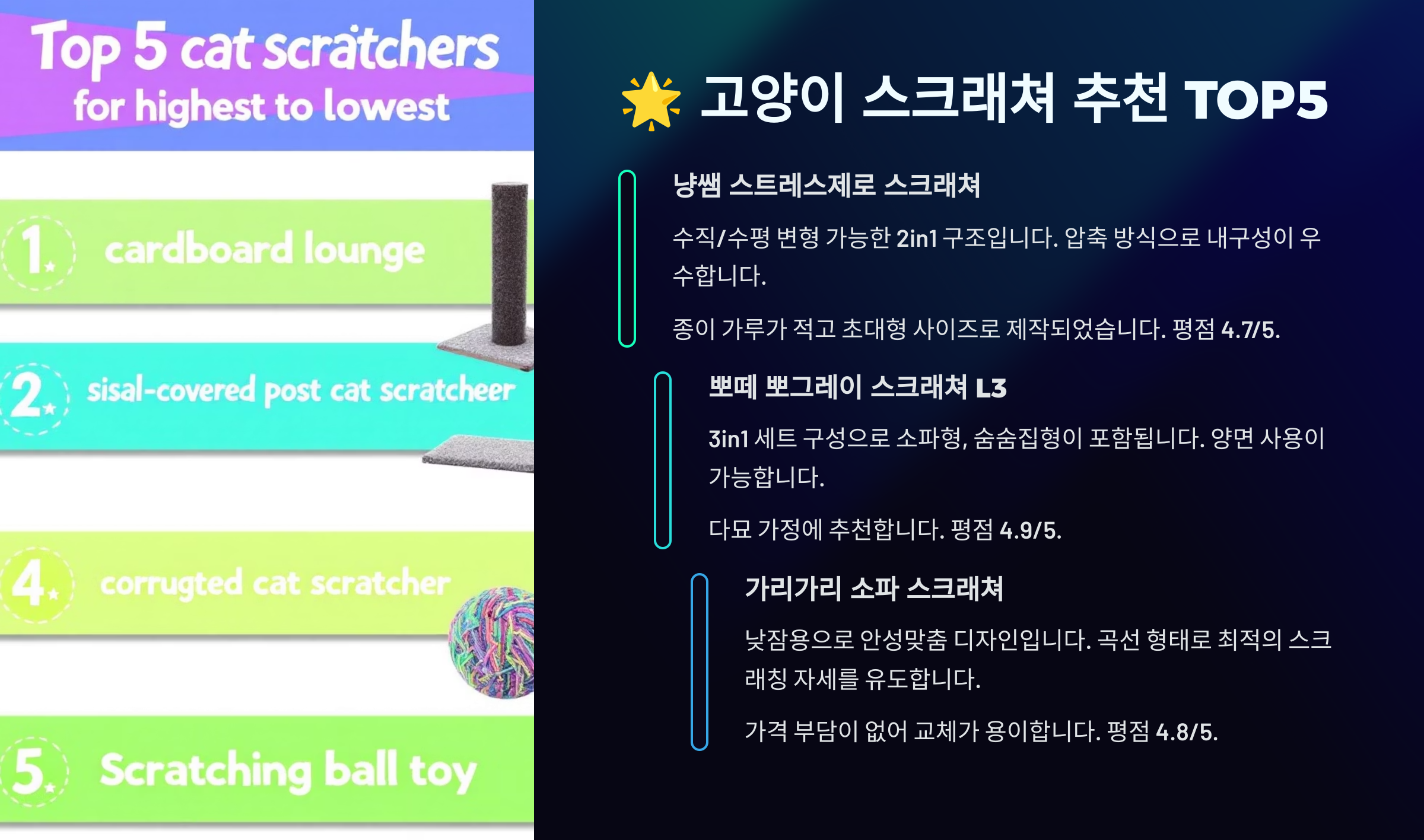 우리 아이에게 맞는 형태와 재질을 알았다면, 이제 본격적으로 🌟 고양이 스크래쳐 추천 TOP5 제품들을 소개할게요! 리뷰, 내구성, 선호도, 가성비 모두 고려해서 뽑았어요! 🛒😺