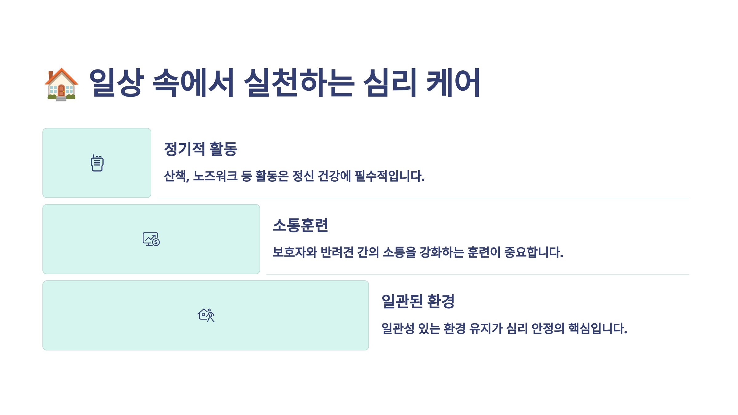 🏠 심리상담만 받고 일상에서는 그대로라면, 상담 효과는 오래 가지 않아요. 가장 중요한 건 일상에서의 실천과 반복이에요. 반려견은 매일 보호자와 나누는 행동과 분위기를 통해 심리적 안정감을 느끼고 신뢰를 쌓거든요.
