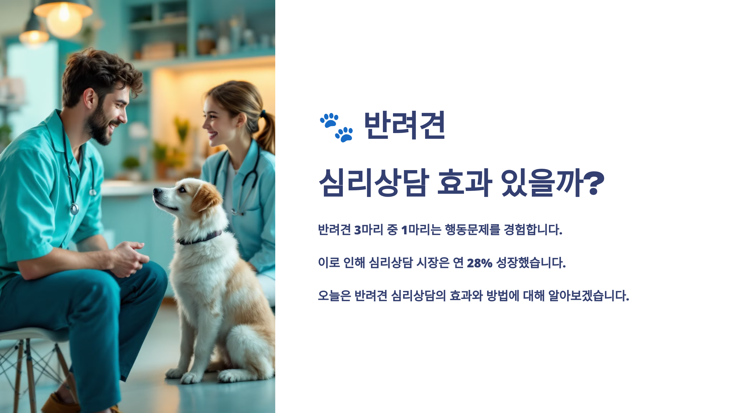 | 대상 문제 | 불안, 우울, 공격성, 분리불안 | 짖기, 배변, 산책 매너 등 |