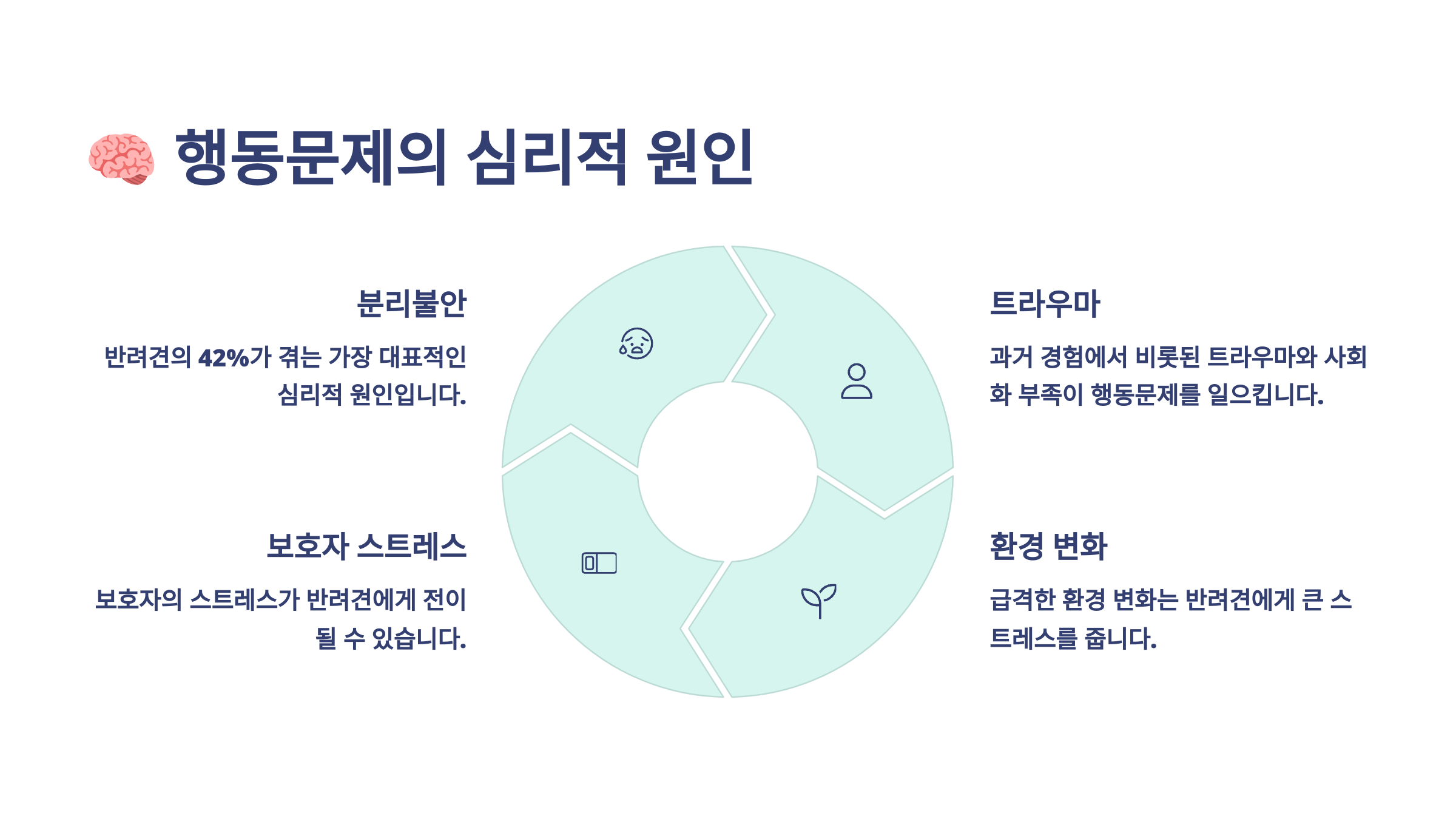 이처럼 반려견의 행동 문제는 대부분 감정의 누적, 환경 스트레스, 보호자와의 소통 부족이 복합적으로 작용해 발생해요. 그래서 단순한 명령 훈련으로는 해결되지 않고, 심리적 원인을 이해하는 것이 선행돼야 해요 🧡