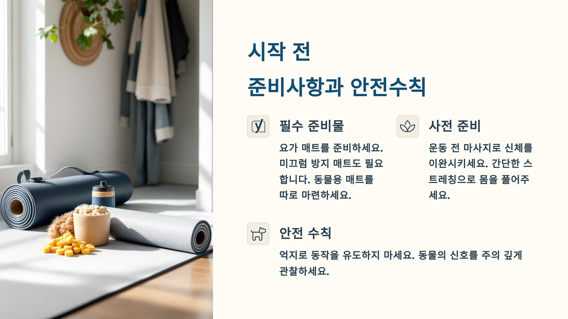 안전수칙 중에서 가장 중요한 것은 절대 무리하지 않는 것이에요. 인간의 요가 동작에 억지로 반려동물을 맞추려고 하지 말고, 반려동물이 편안해하는 범위 내에서만 진행하세요. 반려동물이 스트레스를 받는 신호를 보이면 즉시 중단하고, 충분한 휴식을 주어야 해요. 헥헥거리거나, 침을 많이 흘리거나, 몸을 떨거나, 도망가려고 하는 행동을 보이면 모두 스트레스 신호예요. 이런 신호를 무시하고 계속 진행하면 반려동물에게 트라우마가 될 수 있어요.