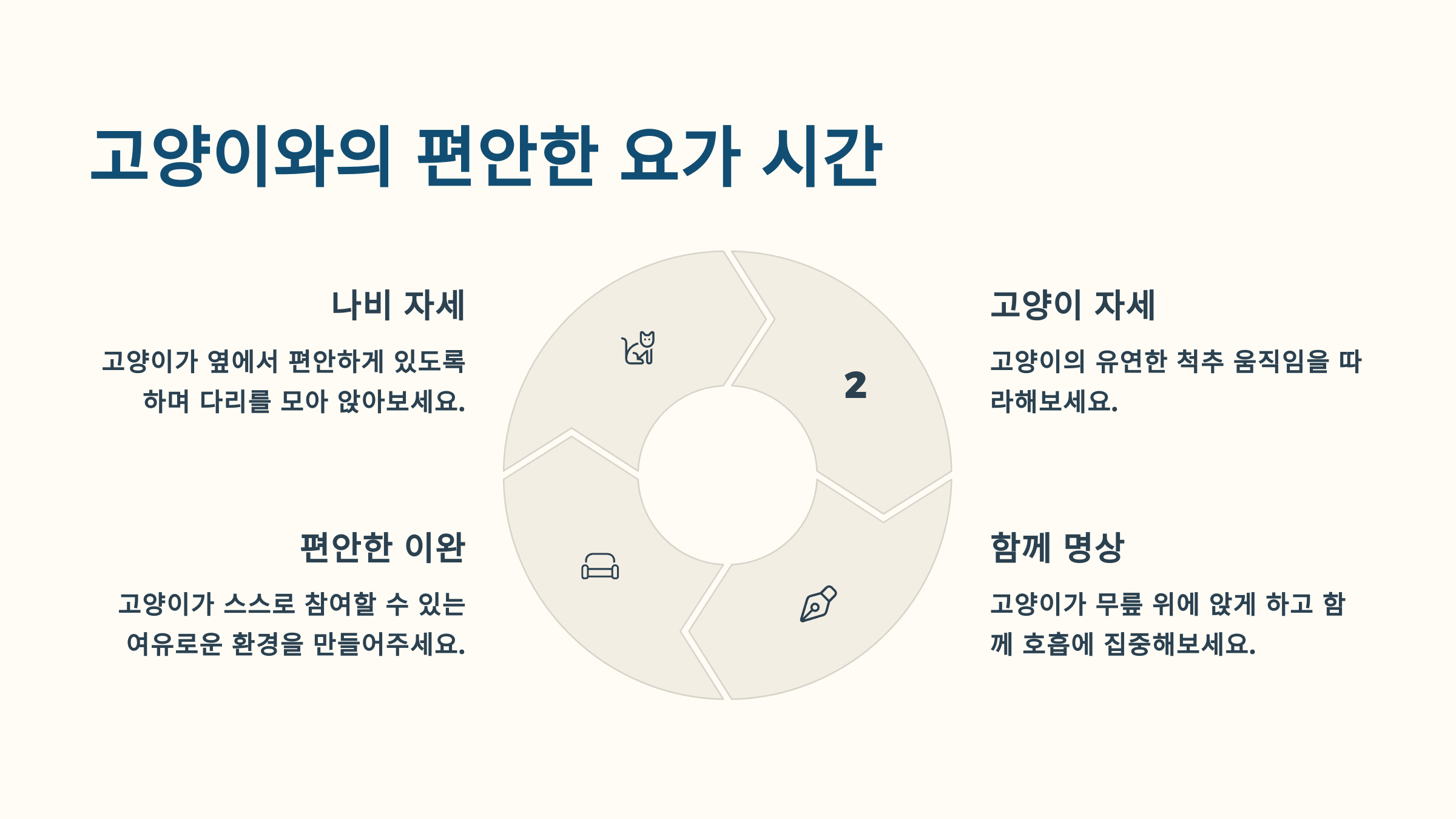차일드 포즈는 고양이들이 가장 좋아하는 인간 자세 중 하나예요. 무릎을 꿇고 앞으로 숙인 자세를 취하면, 고양이들이 등 위에 올라와 앉거나 옆에 와서 함께 쉬는 경우가 많아요. 이 자세는 인간에게는 깊은 이완과 스트레스 해소 효과를 주고, 고양이에게는 따뜻하고 안전한 공간을 제공해줘요. 고양이의 체온과 부드러운 털, 그리고 규칙적인 호흡 소리는 명상 효과를 배가시켜줘요. 이때 고양이가 그르렁거리는 소리는 진동 치료 효과도 있어서 심신 안정에 도움이 되어요.