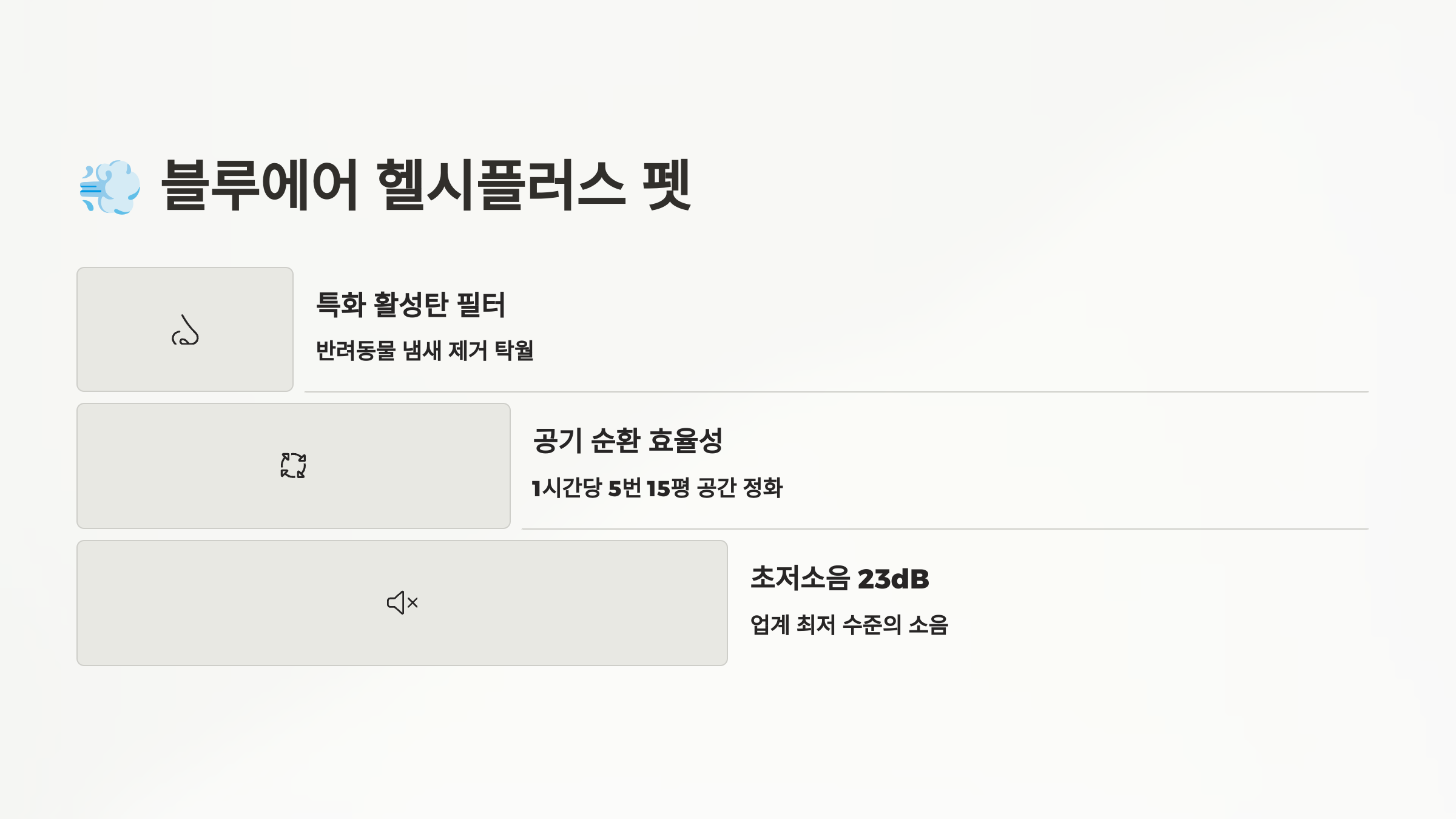 - 🧽 탈취/알러젠 제거 필터 – 반려동물 냄새, 알레르기 유발 입자 강력 흡착