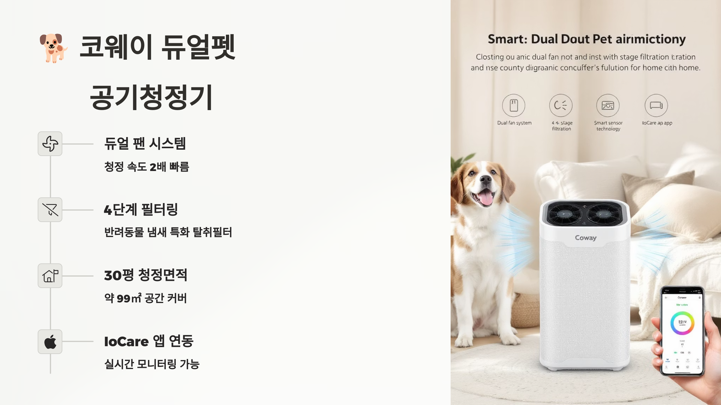 다음은 🐕 코웨이 듀얼펫 공기청정기입니다. 이중 흡입구로 털과 먼지를 강력하게 흡입하고, 반려동물 행동 패턴까지 고려한 고급형 모델이에요!