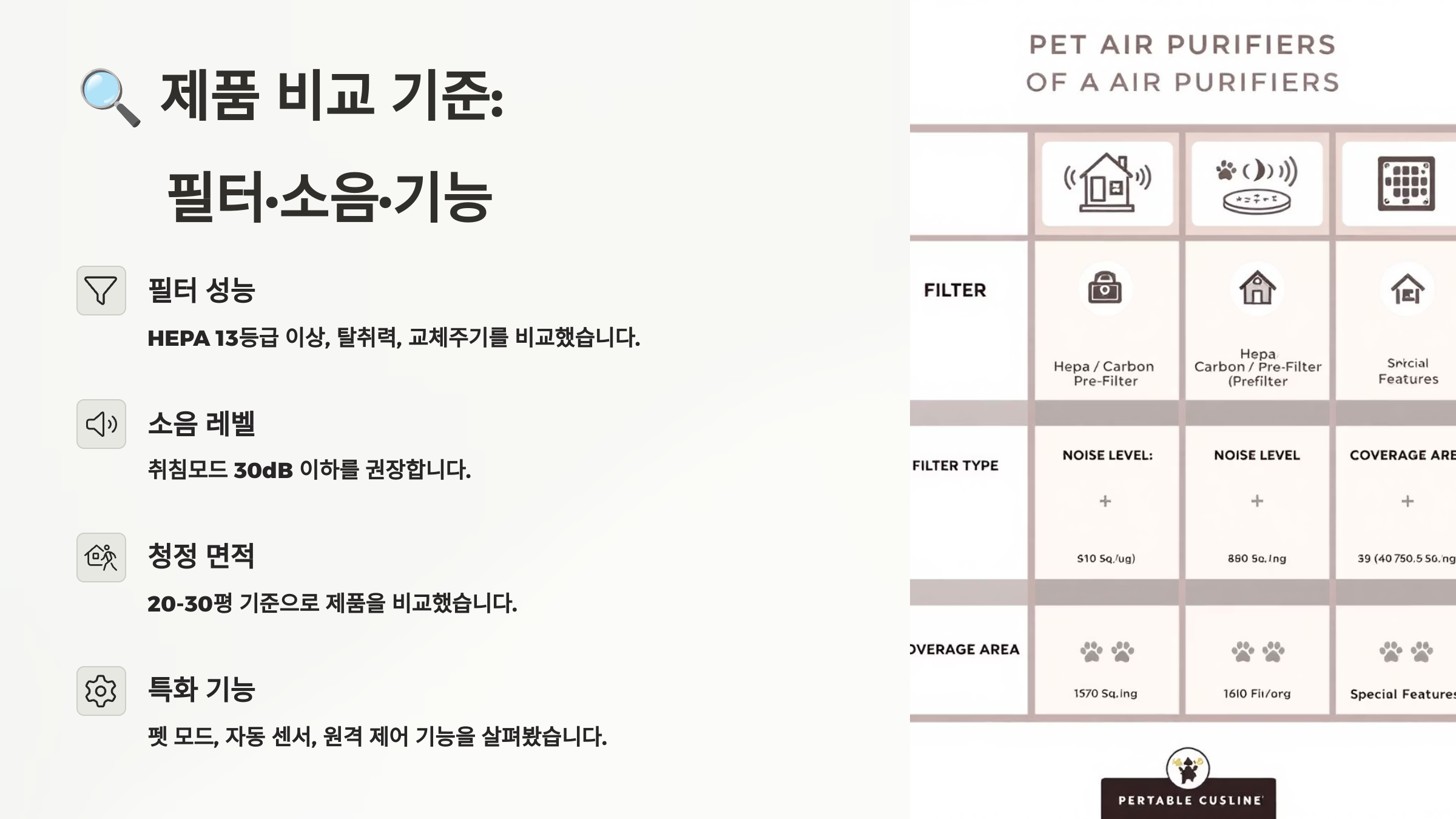 반려동물 전용 공기청정기를 고를 때 가장 중요한 건 일반 공기청정기와 뭐가 다른지를 아는 것이에요. 그래서 아래 3가지 항목을 중심으로 모든 제품을 공정하게 비교했어요! 꼭 체크하고 넘어가야 할 핵심 기준입니다. 🧩
