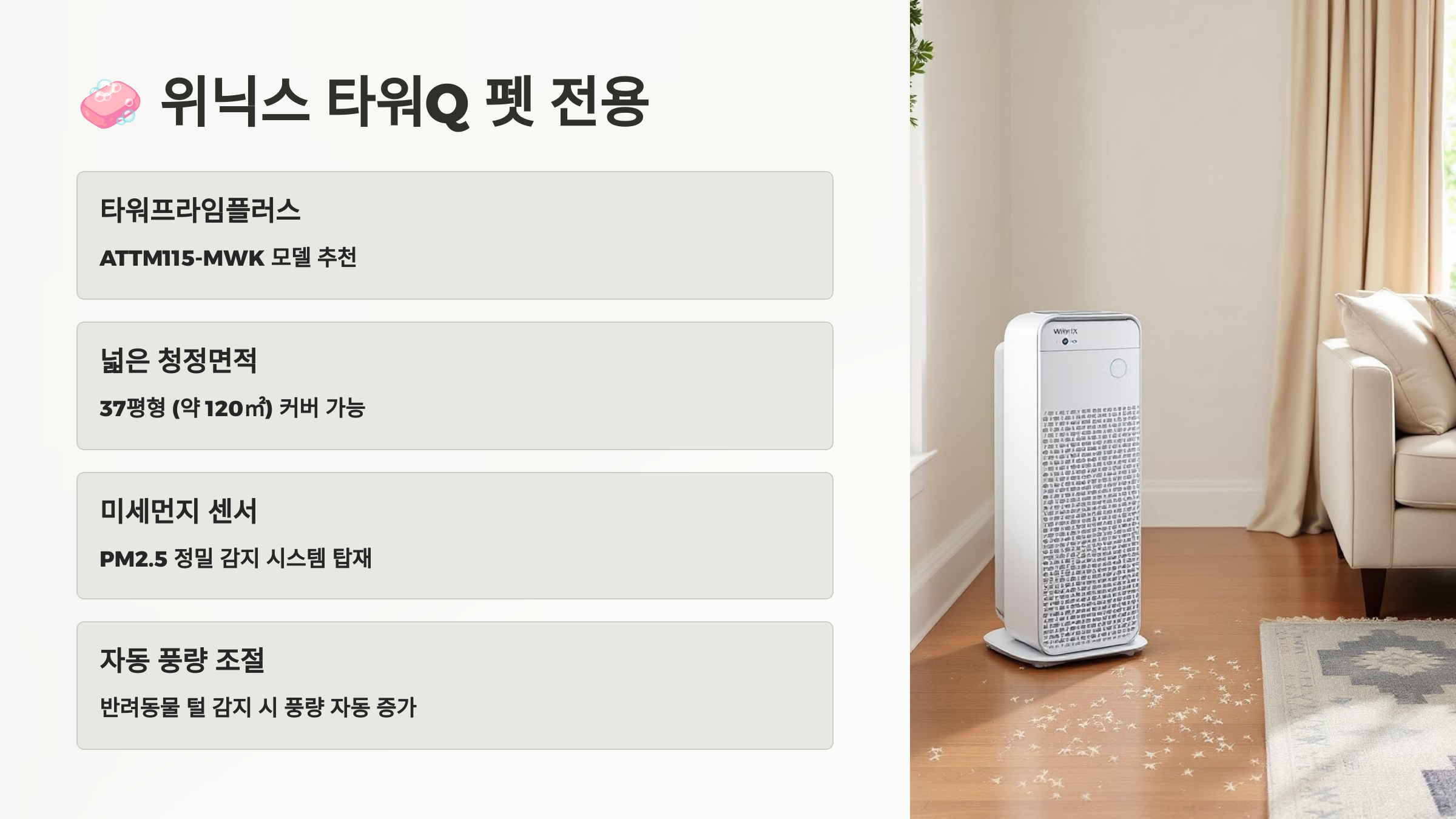 다음은 🧼 위닉스 타워Q 펫 전용입니다. 국내 브랜드 중 가장 인기 있는 펫 맞춤형 모델로, 실속 있는 가격과 확실한 성능을 동시에 잡았어요! 💡