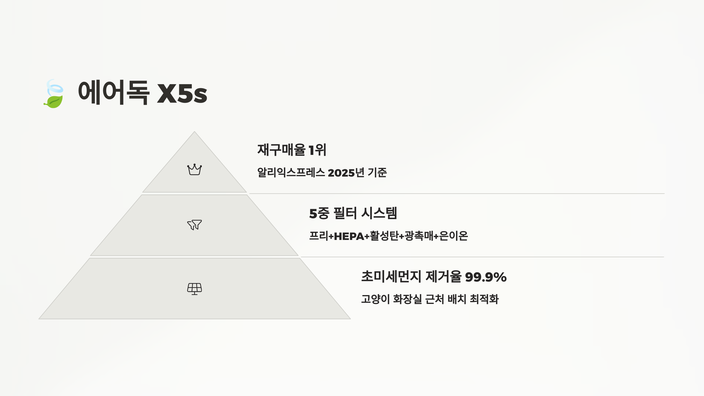 에어독 X5s는 특히 고양이 모래 먼지, 털 날림, 소형견 배변 냄새 등에 민감한 집에 추천돼요. 실내에서 자유롭게 돌아다니는 반려동물이 있다면, 필터 관리 스트레스 없이 쓸 수 있는 최고의 선택이 될 수 있어요! 🐾