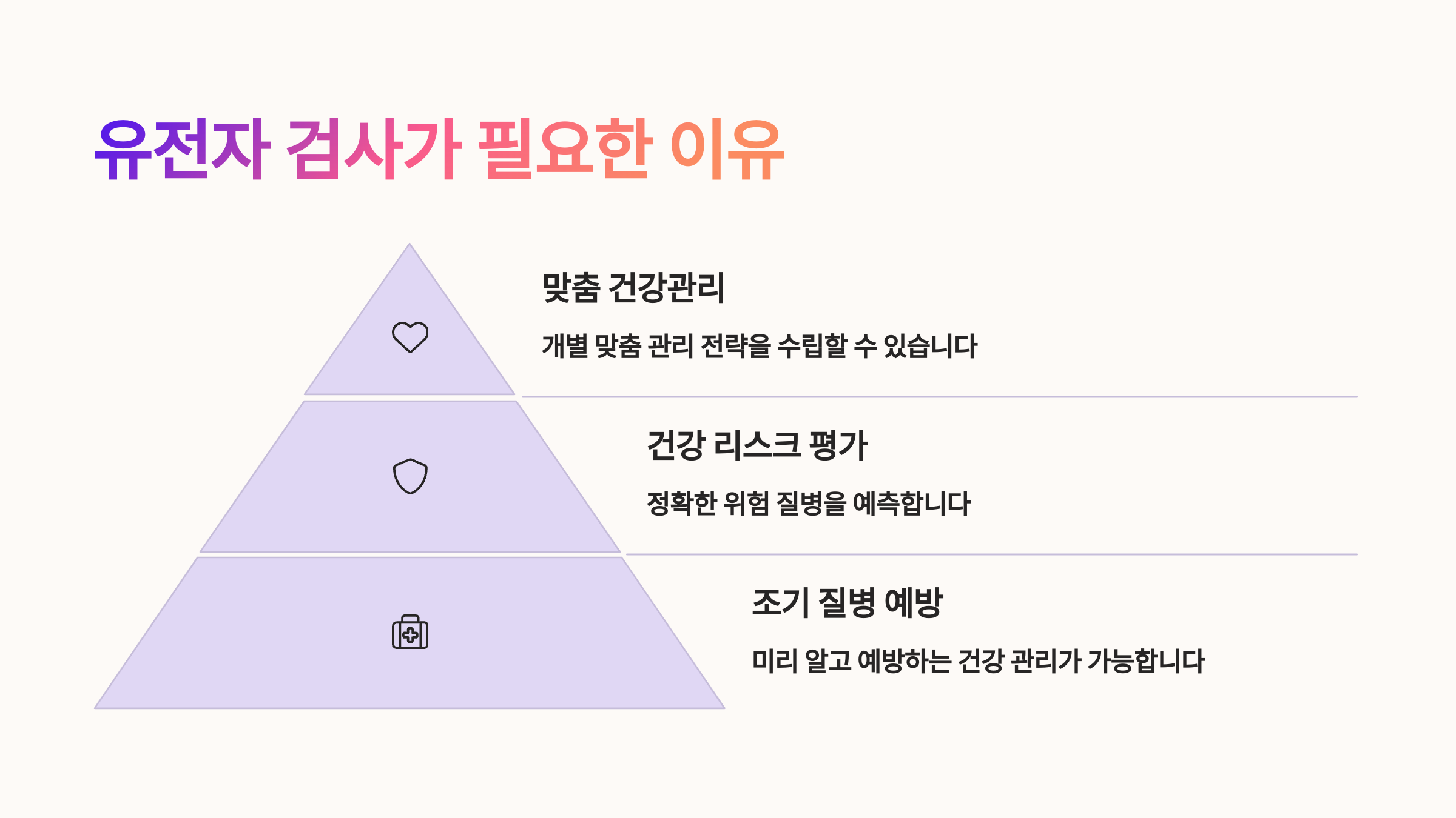 🧠 가장 큰 이유는 바로 건강을 미리 지키기 위한 예방이에요. 질병은 겉으로 나타났을 때 이미 늦는 경우가 많아요. 하지만 유전자를 보면 어떤 병이 발생할 가능성이 높은지 미리 알 수 있죠.