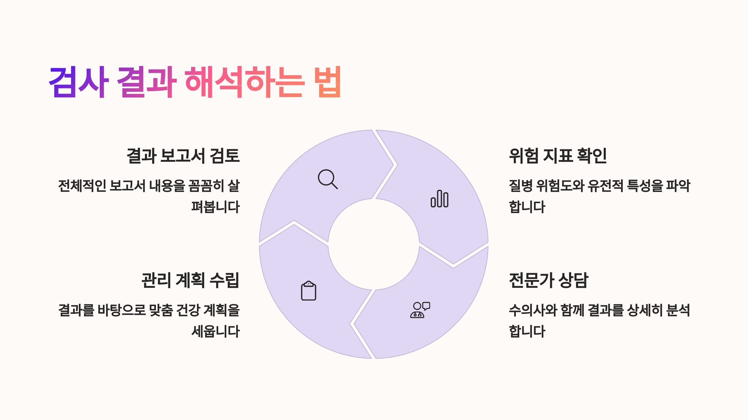🩺 유전자 검사는 단지 정보를 알기 위한 것이 아니라, 건강을 더 잘 관리하기 위한 출발점이에요. 결과를 바탕으로 맞춤 케어를 설계하면 예방과 치료 모두 훨씬 수월해져요.