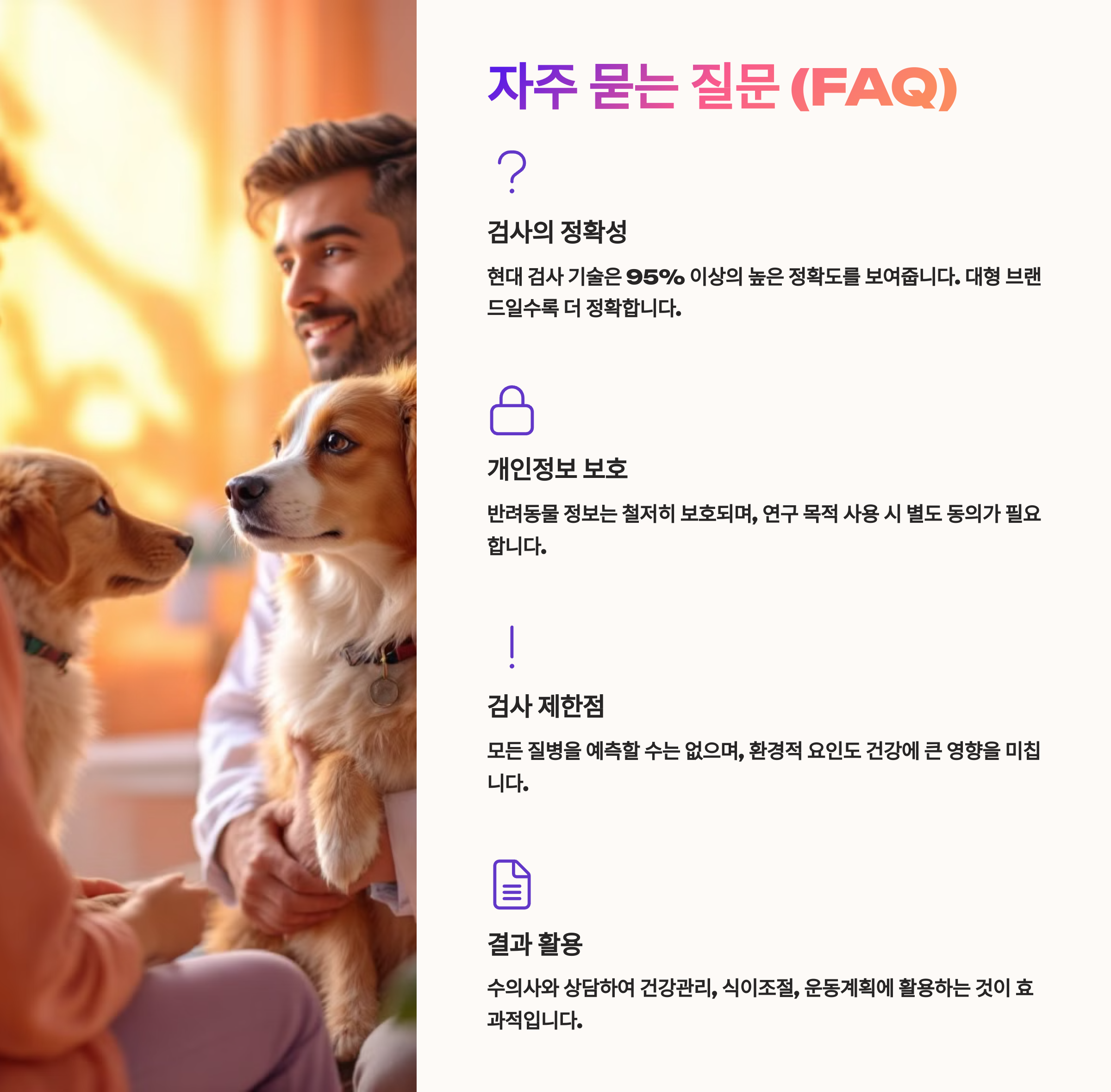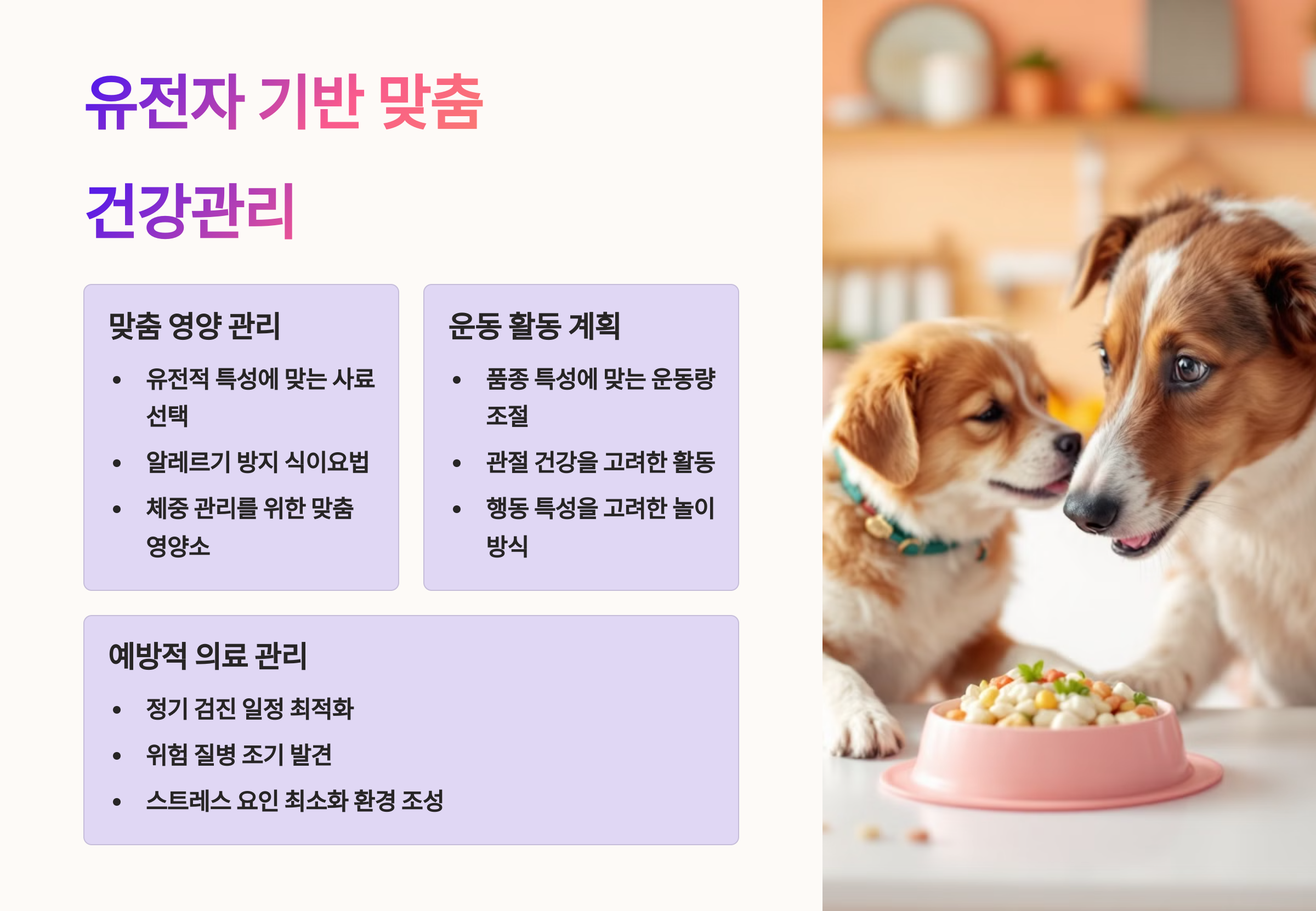 | 유전 질환 예방 | 가족력, 견종 특성 | 조기 건강관리 가능 |