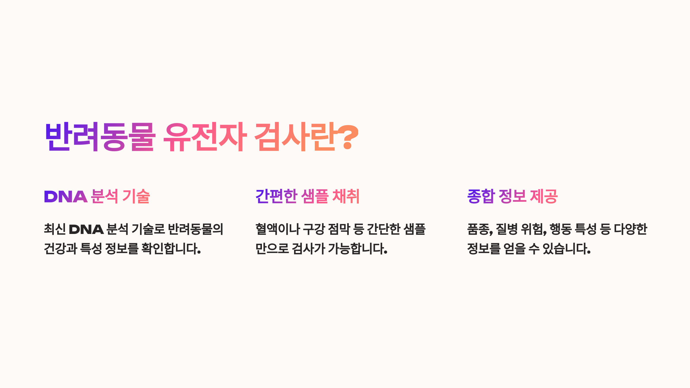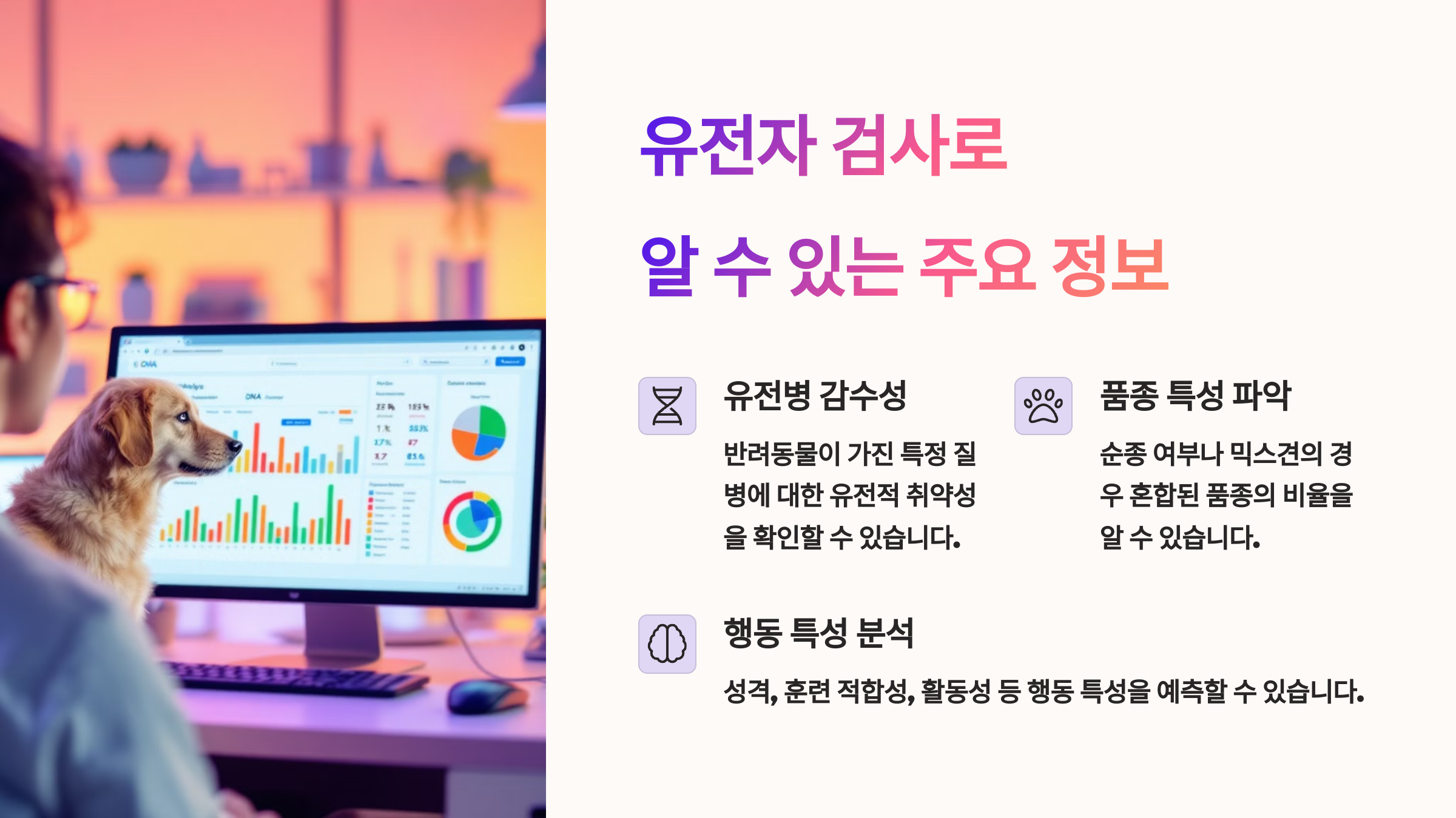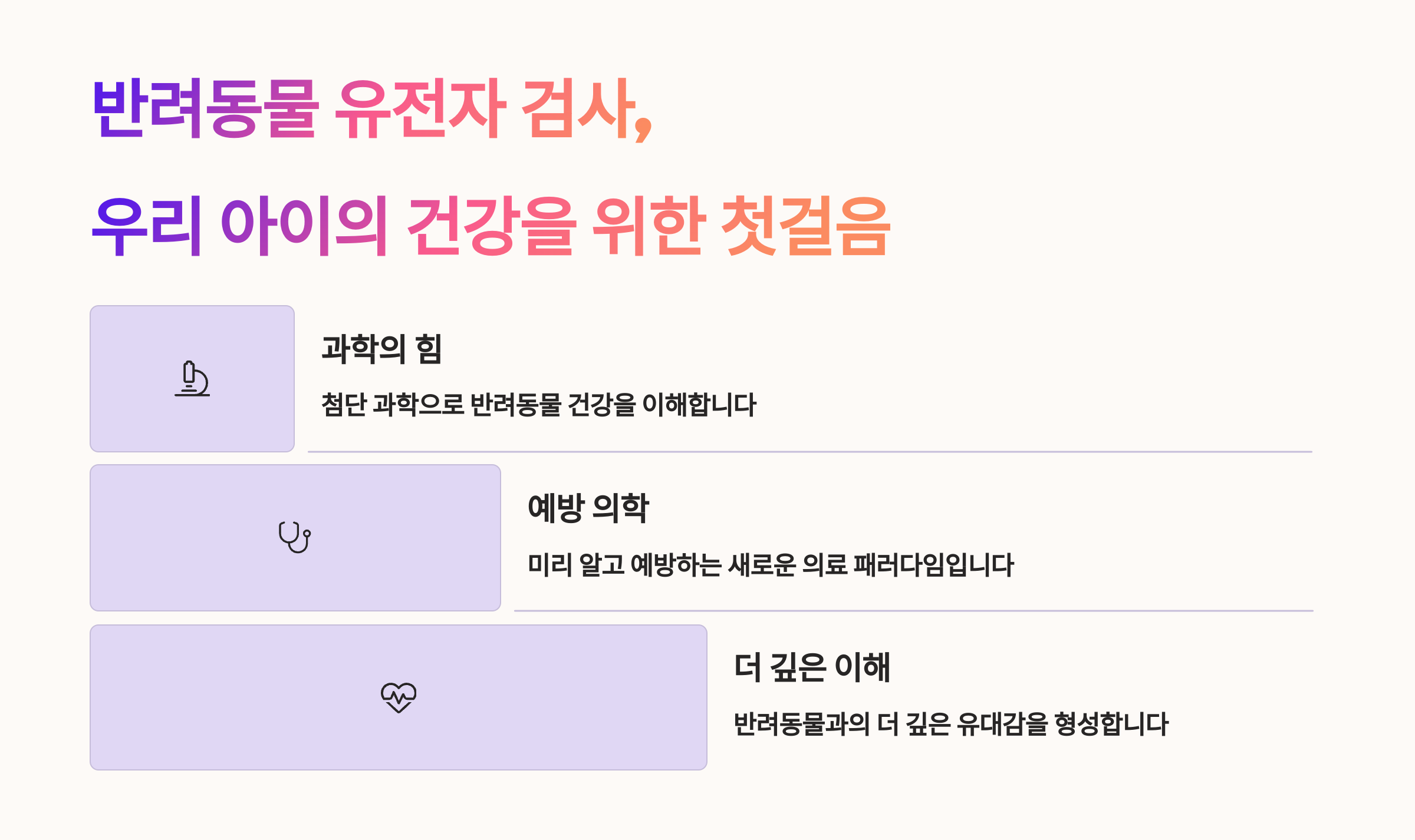 🧬 유전자(DNA)는 생물의 모든 정보를 담고 있어요. 반려동물도 각각 고유한 유전 정보를 가지고 있는데, 이 안에는 유전병, 신체 특성, 식이 반응, 행동 성향 같은 정보가 포함돼 있어요.
