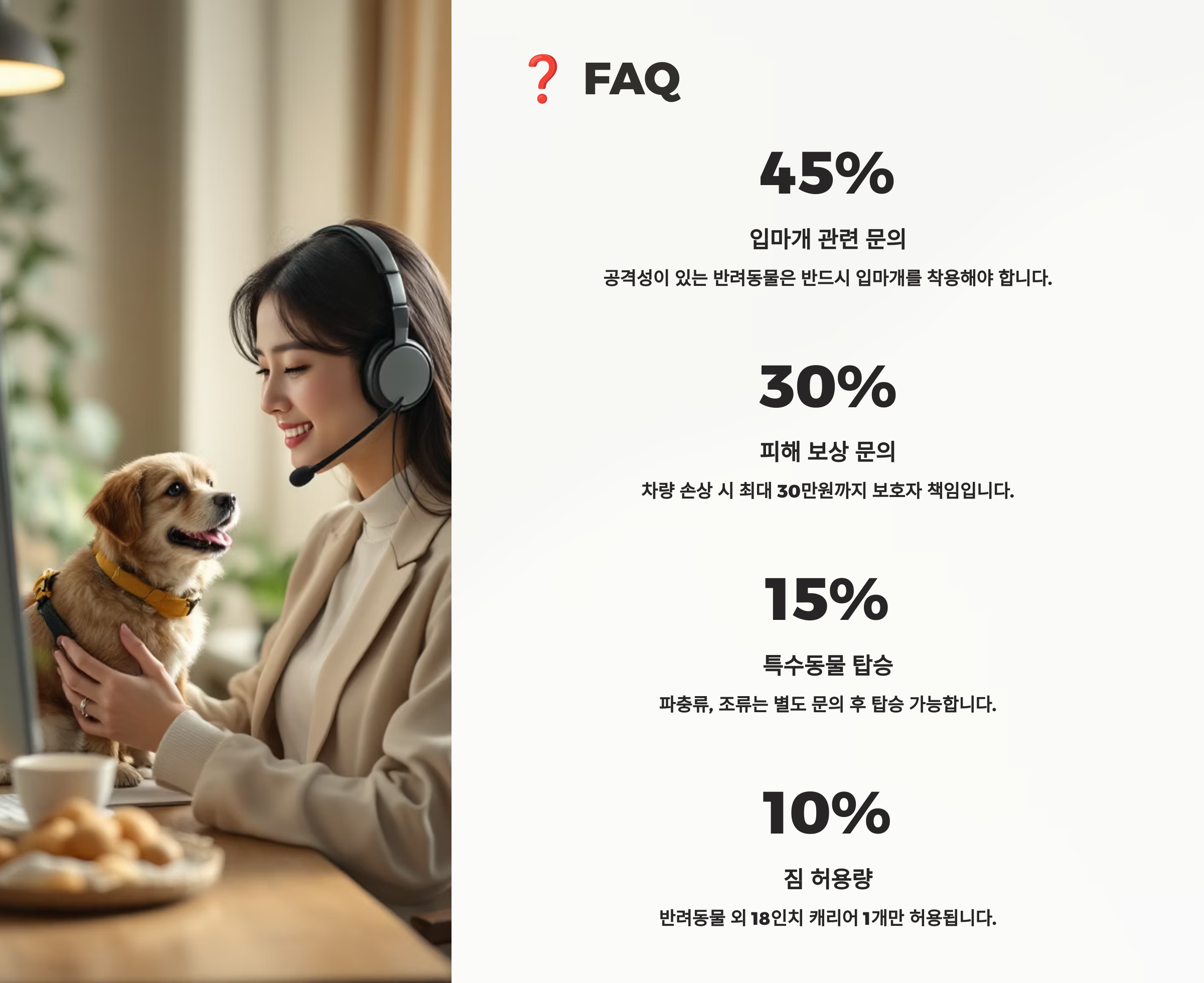 A2. 대부분의 업체는 훈련된 기사님이 운전하며 CCTV, 실시간 알림 등으로 안전하게 관리해줘요. 이동장 필수예요!