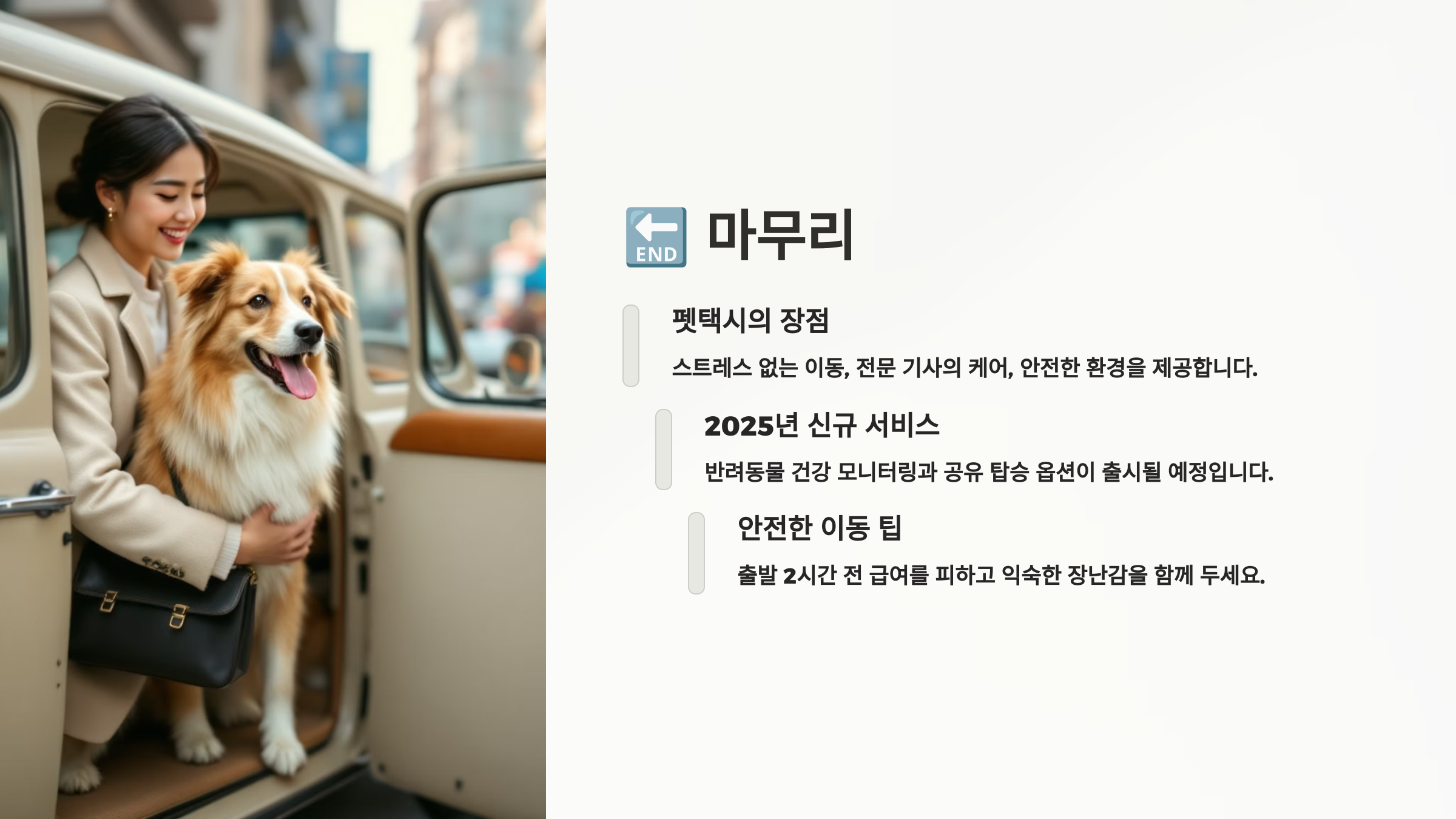 이처럼 펫택시는 단순한 운송을 넘어서, 반려동물 복지를 위한 서비스로 자리 잡고 있어요. 점점 발전 중이라 앞으로 더 다양한 기능과 혜택이 생길 것으로 기대돼요! 🚗