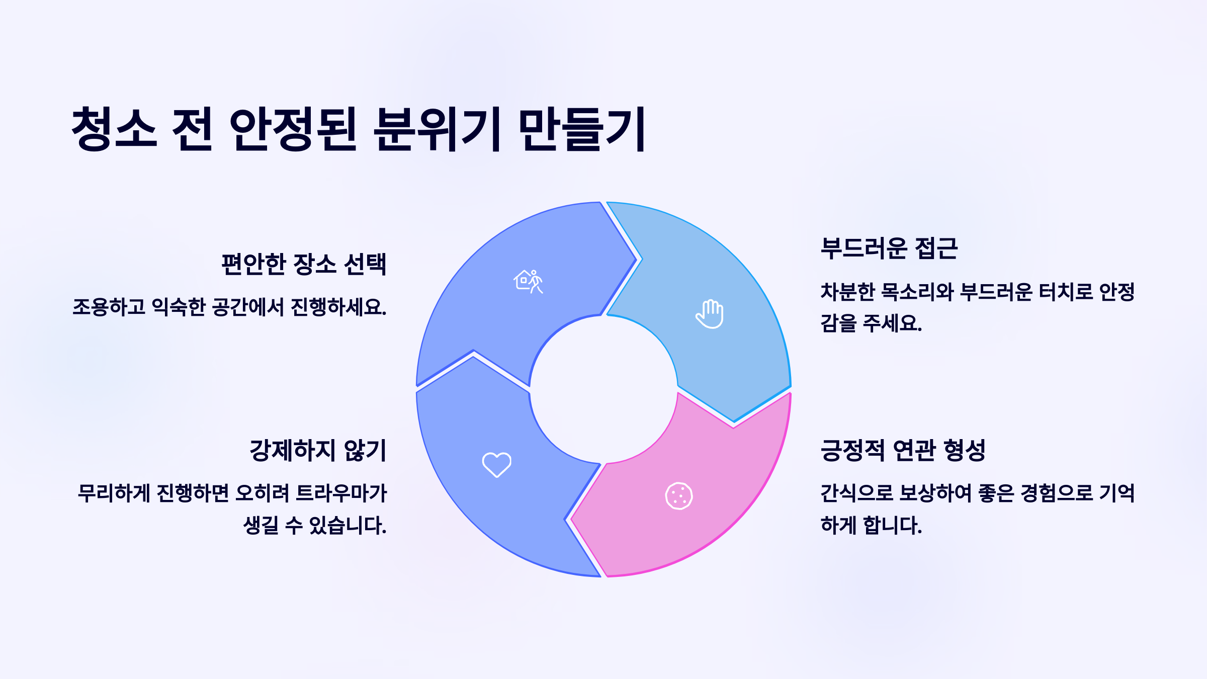 🎵 조용한 배경 음악이나 좋아하는 간식을 준비해두면 강아지가 긴장을 덜고 청소에 대한 인식도 긍정적으로 바뀔 수 있어요.