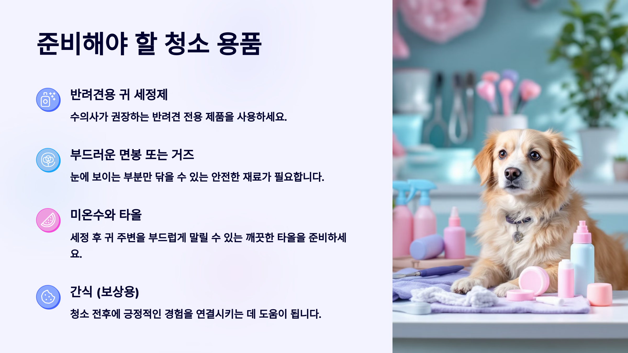 - 강아지 전용 귀 세정제 - 멸균 거즈 or 화장솜 - 간식 or 장난감 (보상용) - 타월 or 무릎 담요 - LED 손전등 (귀 안 살펴볼 때 유용)