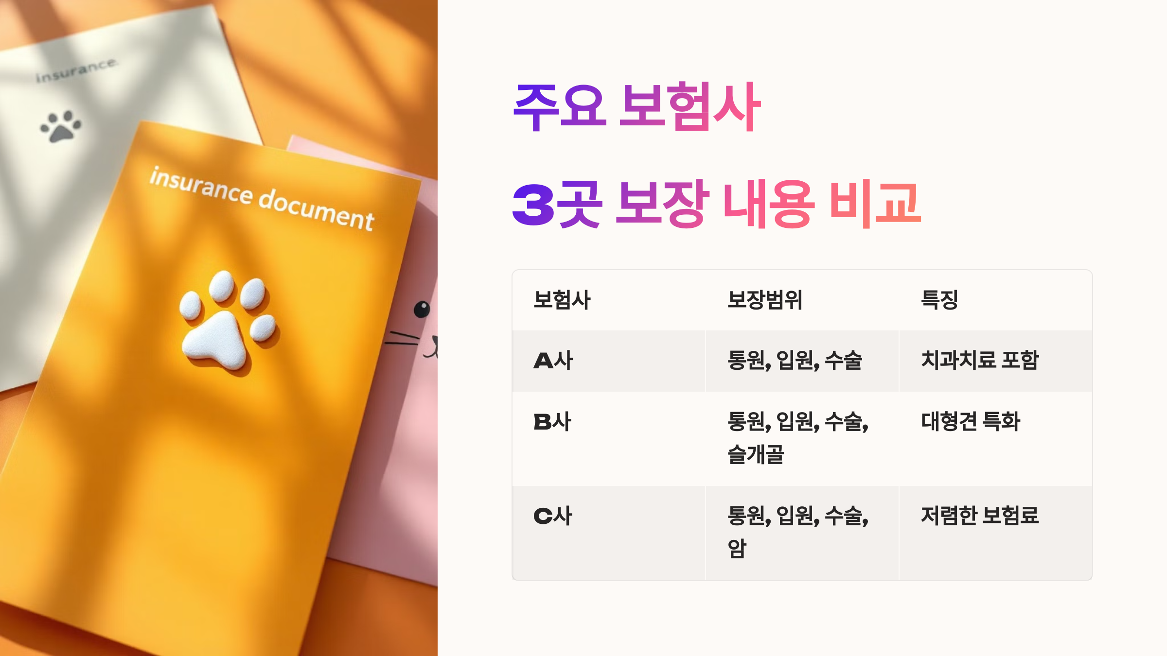 2025년 기준으로 가장 많이 가입하는 펫보험 3사는 A사, B사, C사예요. 각 보험사마다 보장 항목이 조금씩 달라서 비교는 필수예요. 아래 표로 보장 범위, 보장 비율, 특약을 정리했어요 🐕🦺