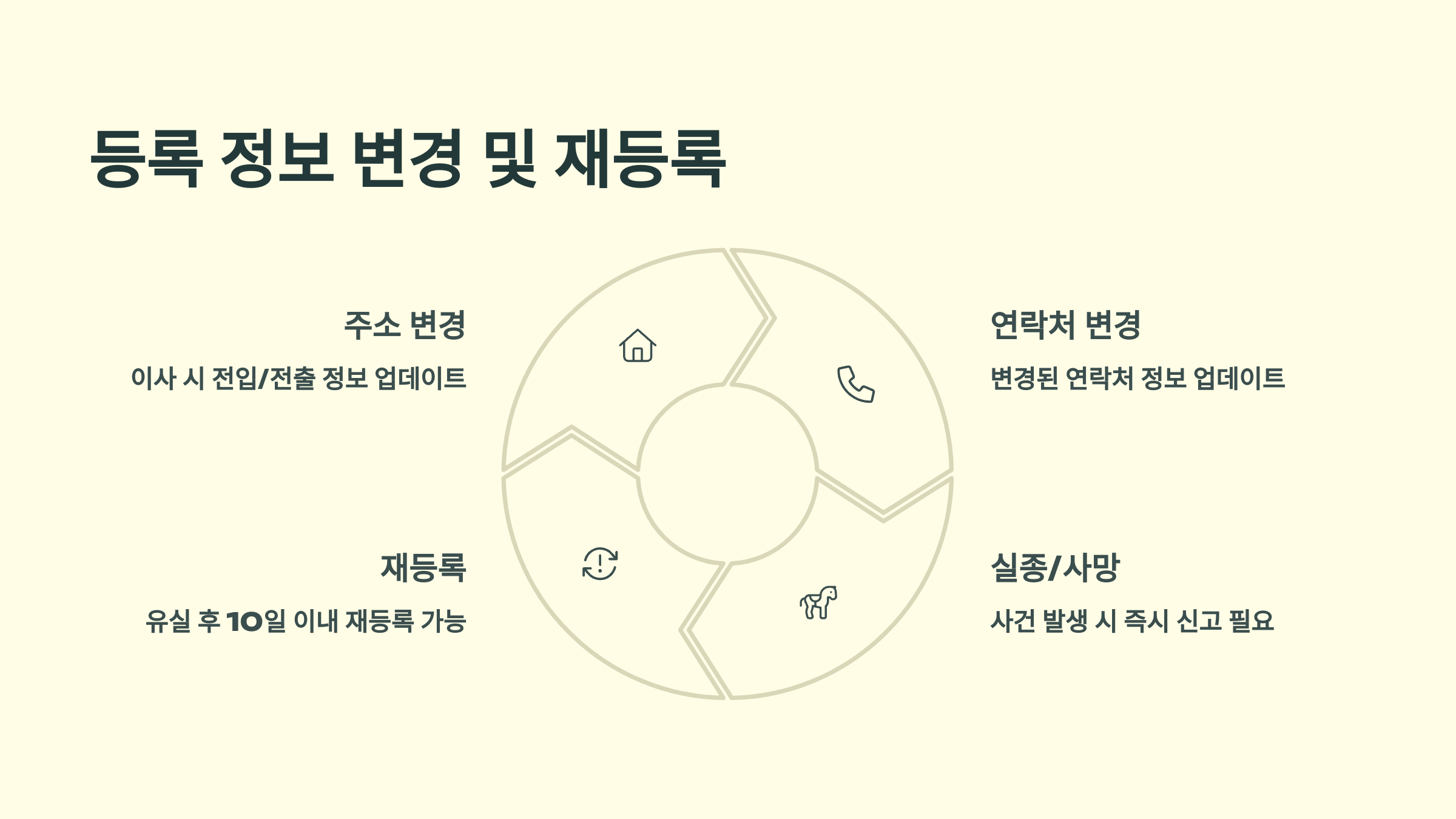 등록만으로 끝이 아니에요! 주소 이전, 소유자 변경, 등록장치 분실 등 상황이 달라지면 반드시 변경 신고를 해야 해요 🐶📑