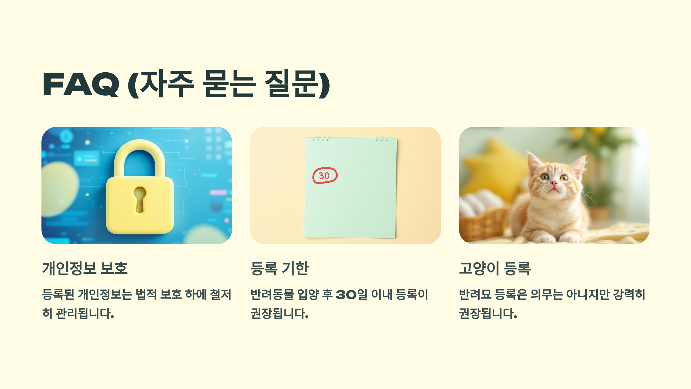 반려동물 등록은 법을 지키는 책임 있는 행동이자, 사랑하는 아이를 지키는 최선의 방법이에요! 이제 다음은 ❓ FAQ (자주 묻는 질문) 정리해줄게요! 🐶💬