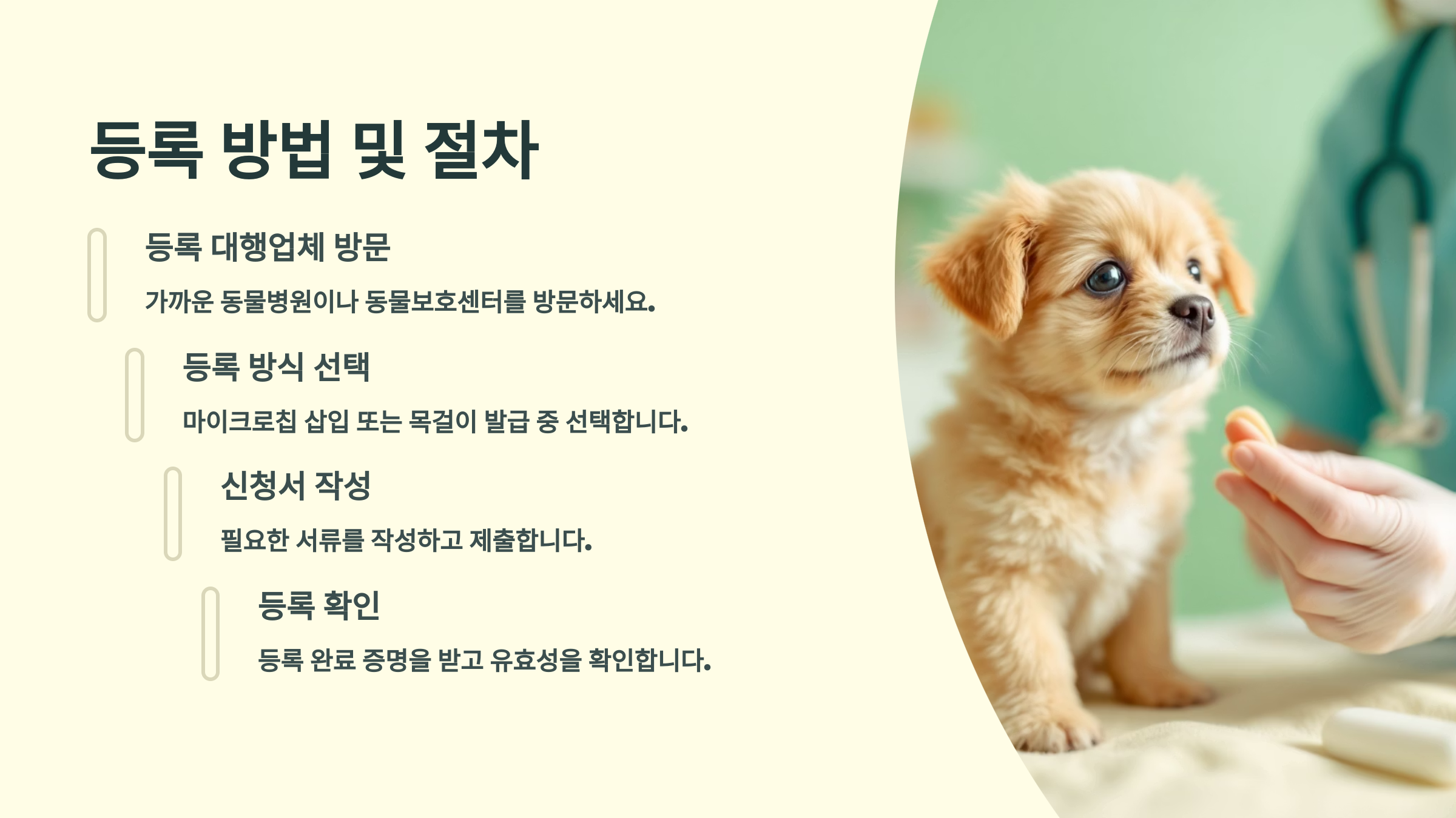 반려동물 등록은 생각보다 간단해요. 주민센터나 등록 대행 동물병원에 방문하면 직접 상담받고 등록까지 한 번에 끝낼 수 있답니다! 🐾🩺