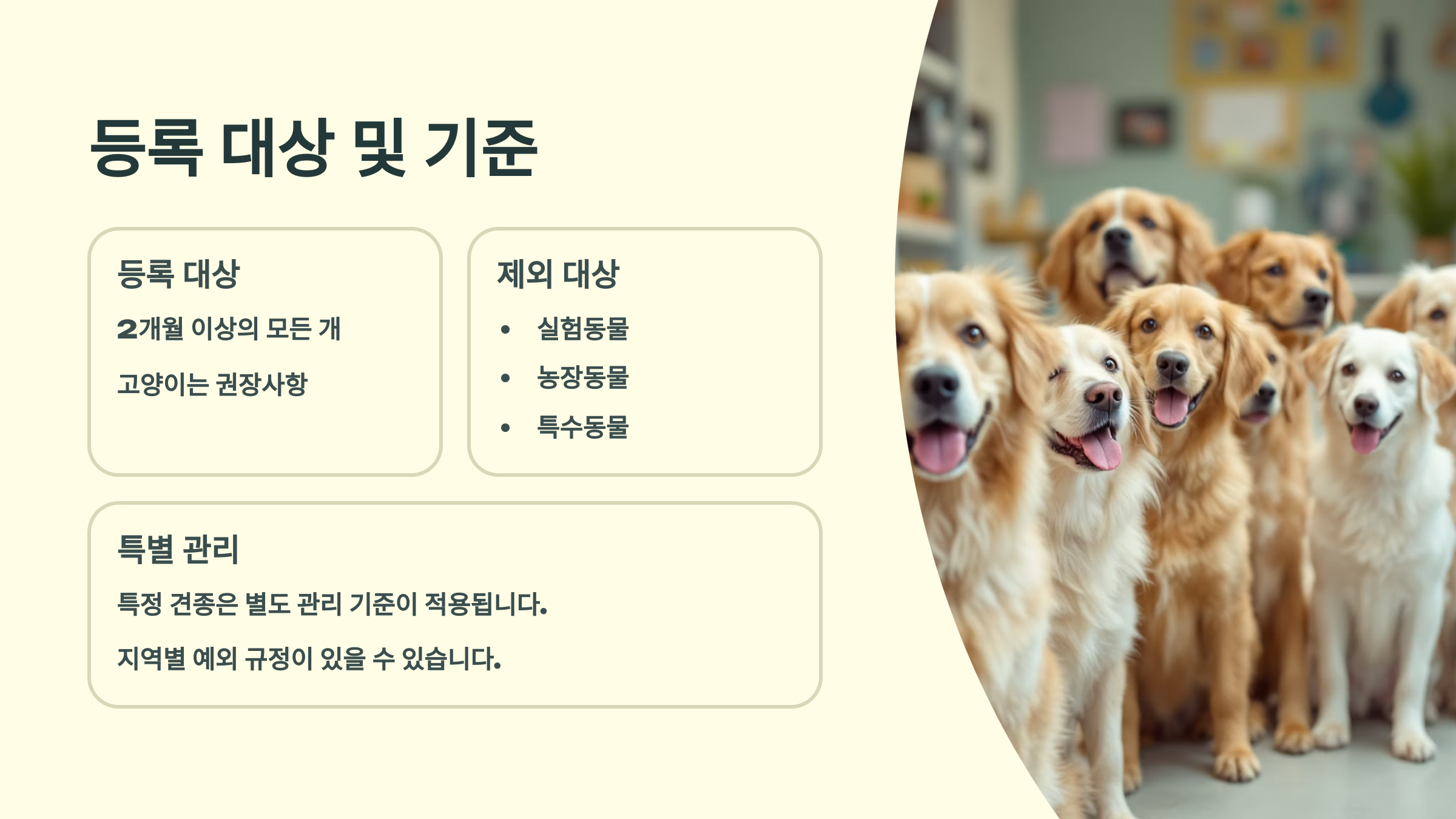 현재는 3개월령 이상의 반려견이라면 의무적으로 등록해야 해요. 고양이나 특수 반려동물은 아직 의무 대상은 아니지만, 일부 지자체는 등록을 권장하고 있답니다 🐾