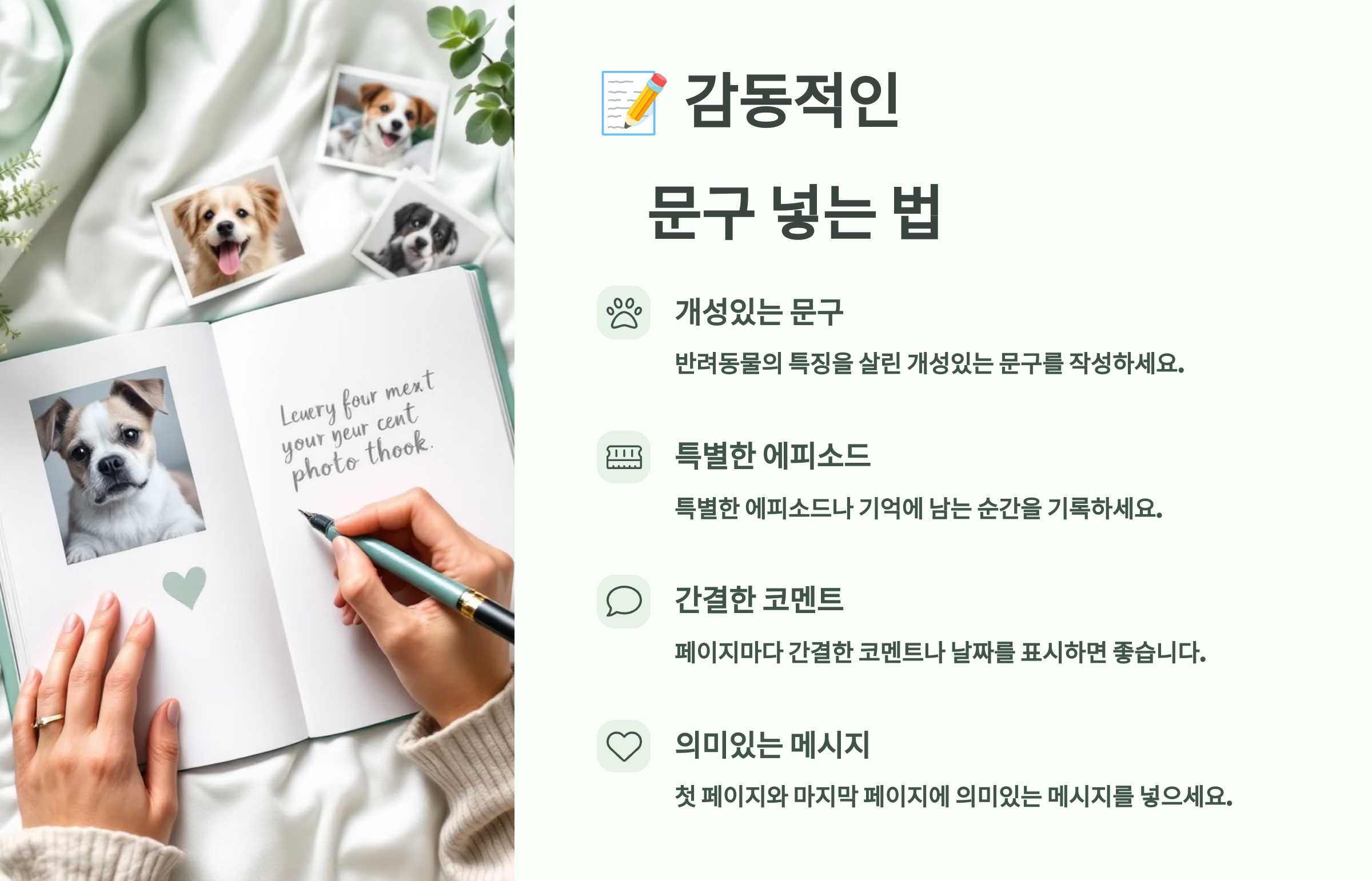 디자인은 감성을 전달하는 수단이에요. 내 반려동물의 귀여움과 사랑스러움을 예쁘게 보여줄 수 있는 디자인을 고민해보세요. 다음 섹션에서는 문구, 텍스트로 감동을 더하는 팁들을 알려드릴게요! 🐕📖