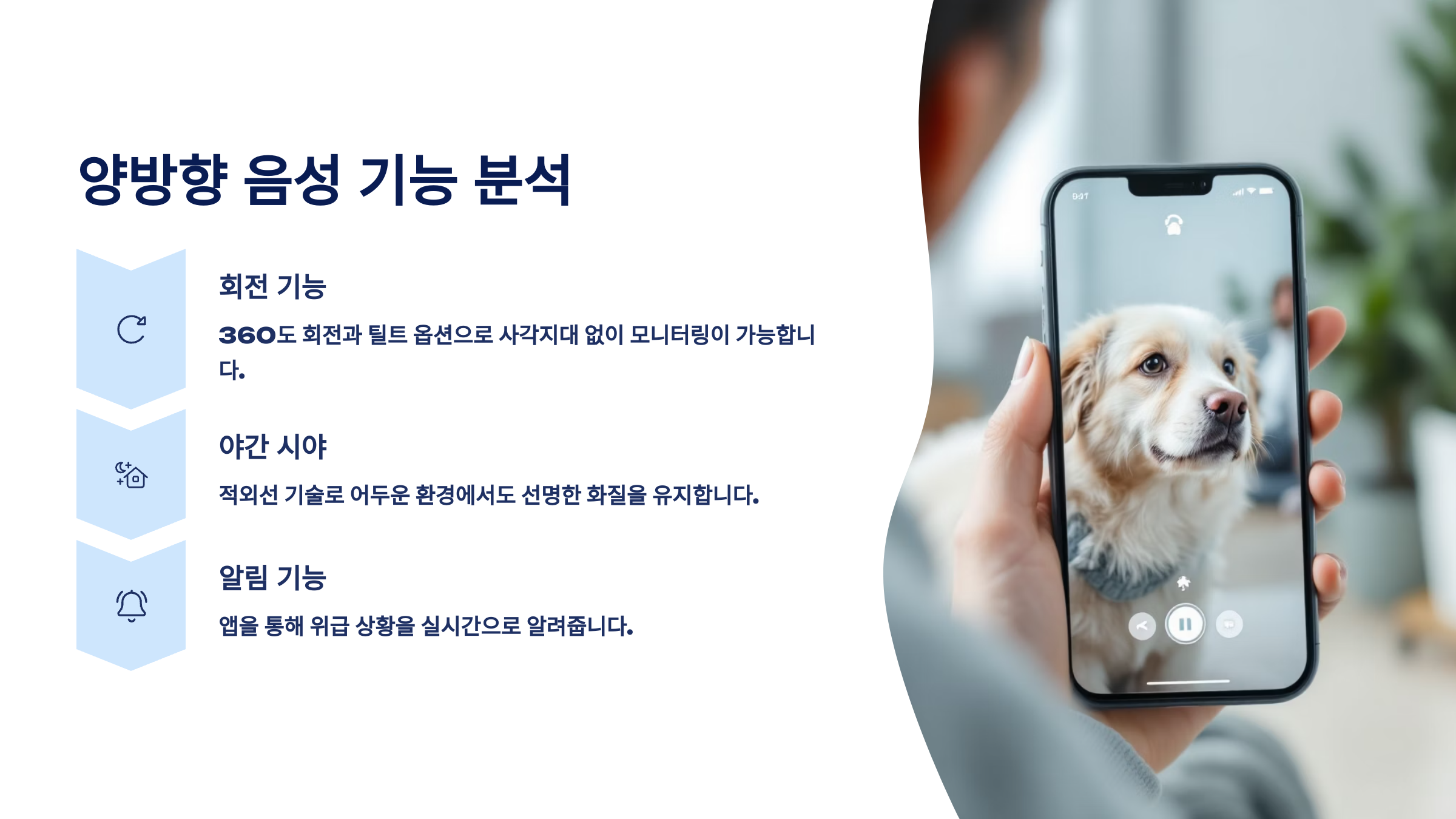 양방향 음성 기능은 반려동물 카메라의 핵심 기능 중 하나예요. 단순히 아이의 모습을 보기만 하는 것이 아니라, 목소리로 직접 소통할 수 있기 때문에 반려동물도 더 안정감을 느낄 수 있어요. 🐶🎧