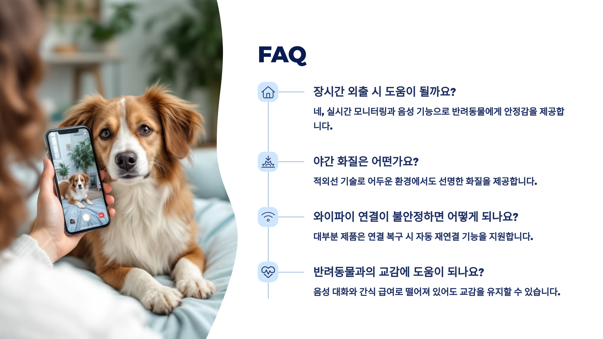 사용자 후기를 보면, 반려동물 카메라는 단순한 관찰 기기를 넘어, 함께하는 삶의 도구로 자리 잡고 있다는 걸 느낄 수 있어요. 다음은 여러분이 가장 궁금해할 ❓ FAQ 섹션이에요.