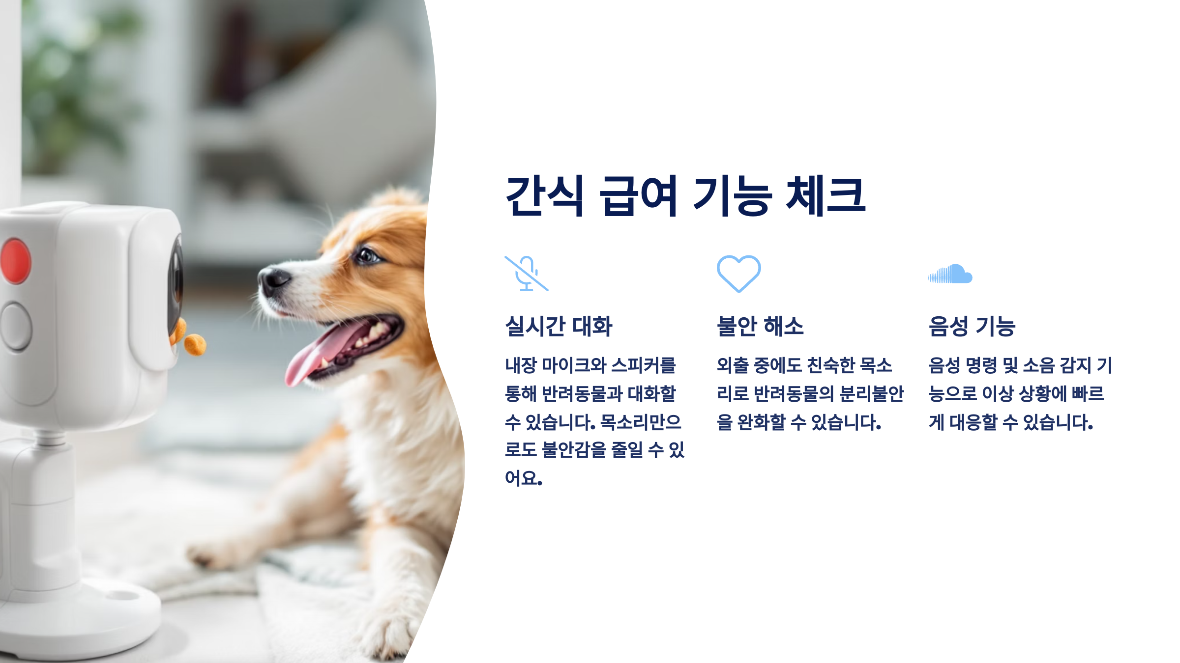 간식 급여 기능은 단순한 보상 그 이상이에요. 외출 중 아이가 심심하지 않도록 하고, 주인의 존재감을 계속 느끼게 해줘요. 매번 나와 놀아주지 못하더라도 기계가 대신 반려동물의 하루를 채워줄 수 있다는 게 정말 큰 장점이에요. 💕
