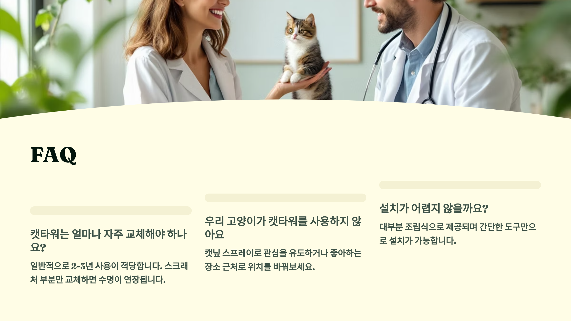 A1. 필수는 아니지만, 고양이의 본능(점프, 숨기, 긁기)을 해소해줄 수 있는 공간이라 있으면 훨씬 안정적인 생활을 해요.