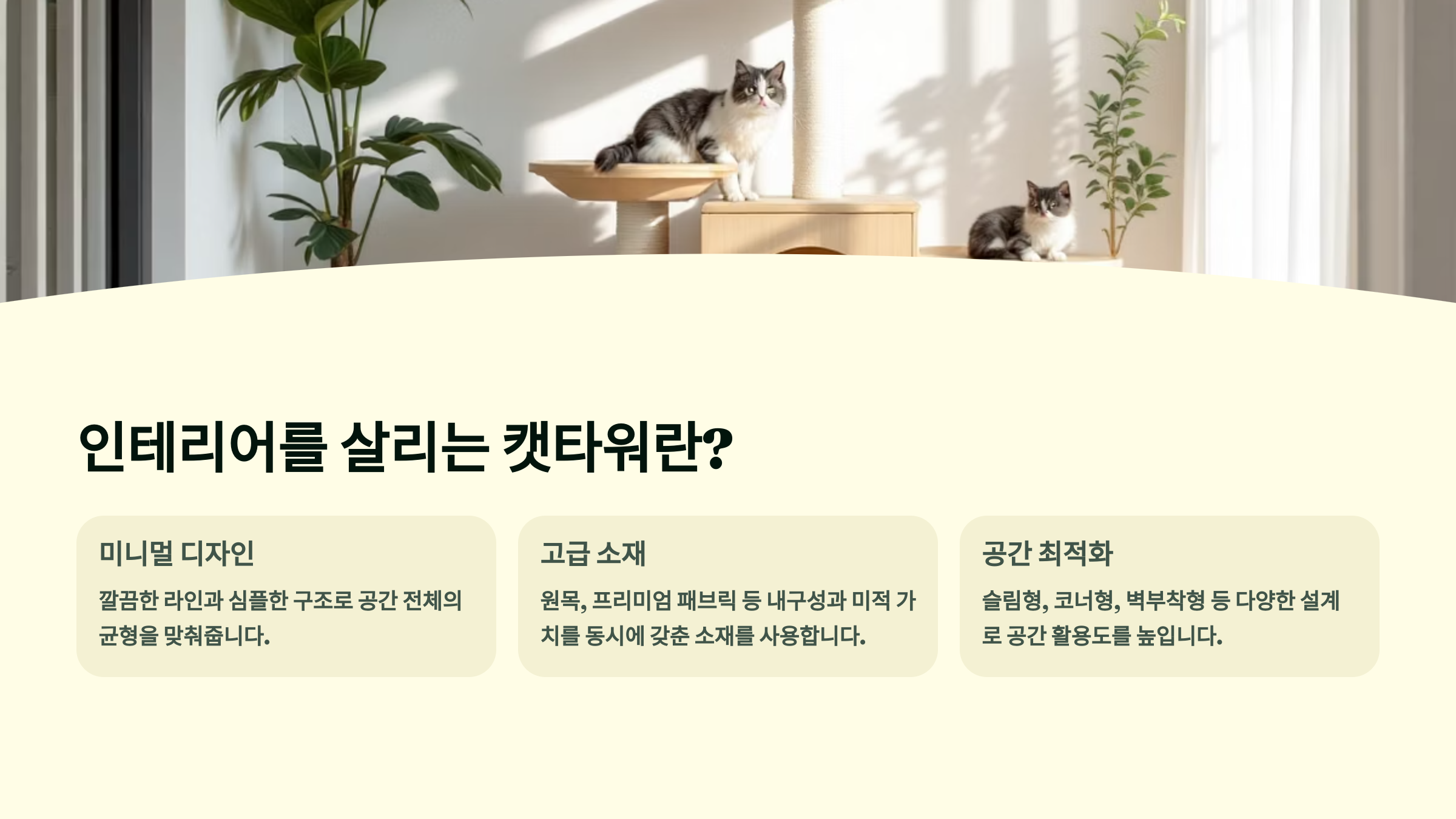 요즘 집사들의 가장 큰 고민 중 하나는 “캣타워가 우리 집 분위기를 망쳐요...” 라는 거예요. 아무리 고양이를 위한 공간이라도, 거실 한가운데 회색 펠트에 싸인 삐죽삐죽한 탑이 세워져 있다면 인테리어 완성도는 확 떨어지죠! 😅