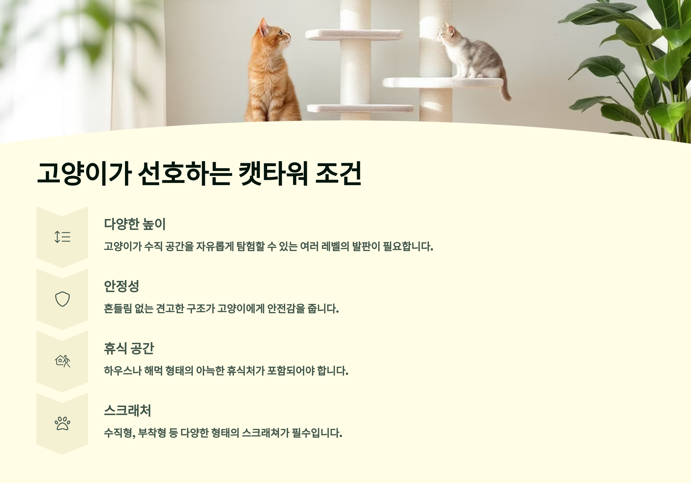 인테리어는 사람 기준이라면, 고양이 입장에서 좋은 캣타워는 따로 있어요! 예쁘기만 한 타워는 고양이 외면받기 십상이고, 진짜 잘 쓰는 캣타워는 이 조건들을 갖춘 경우가 많아요. 👇