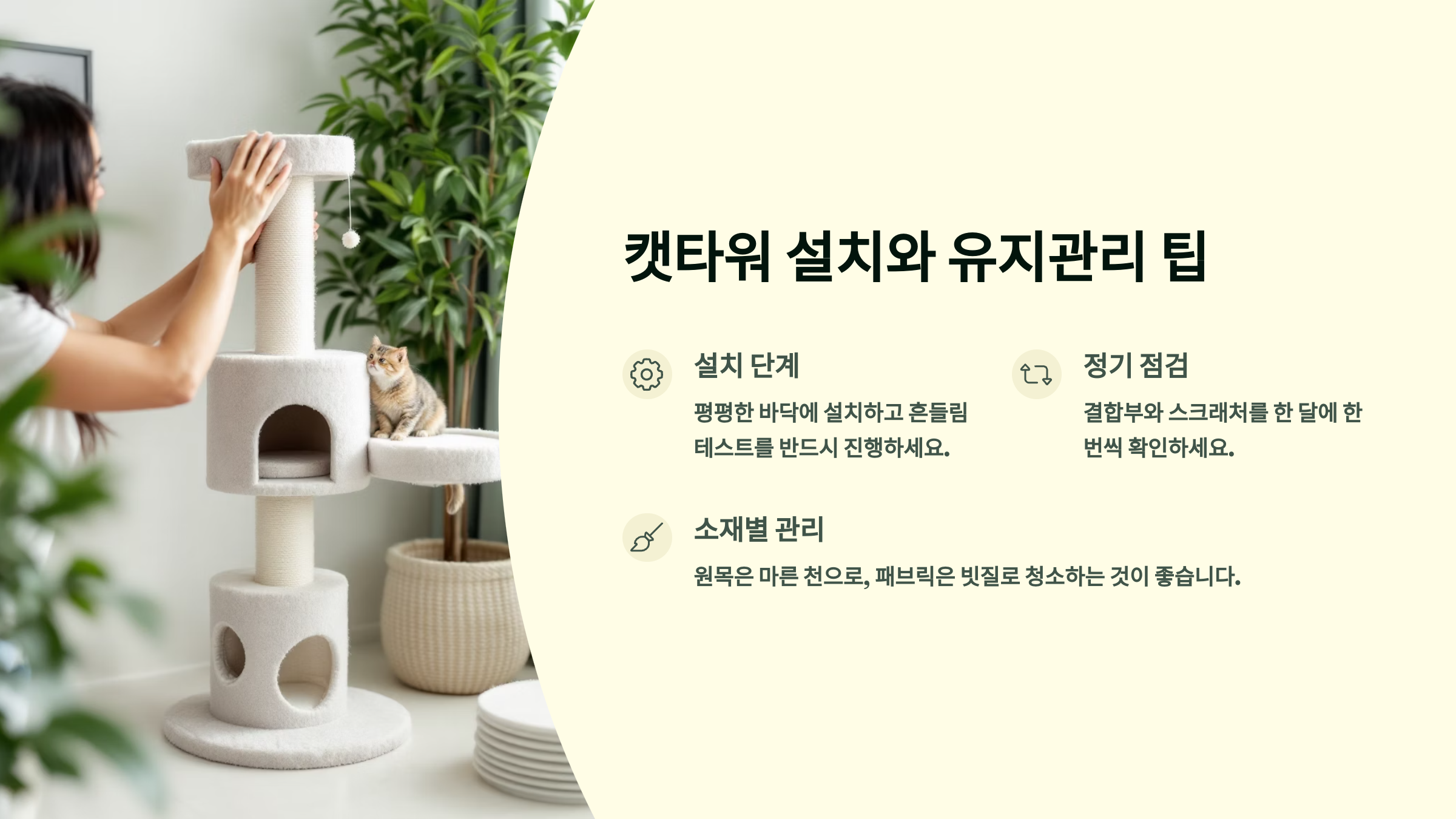 📌 유지 관리를 잘 해줘야 고양이도 오래 쓰고, 집사도 보기 좋아요! 예쁜 거 하나 놨다고 끝나는 게 아니라 고양이와 함께하는 '가구'라는 생각으로 접근해보세요 😽