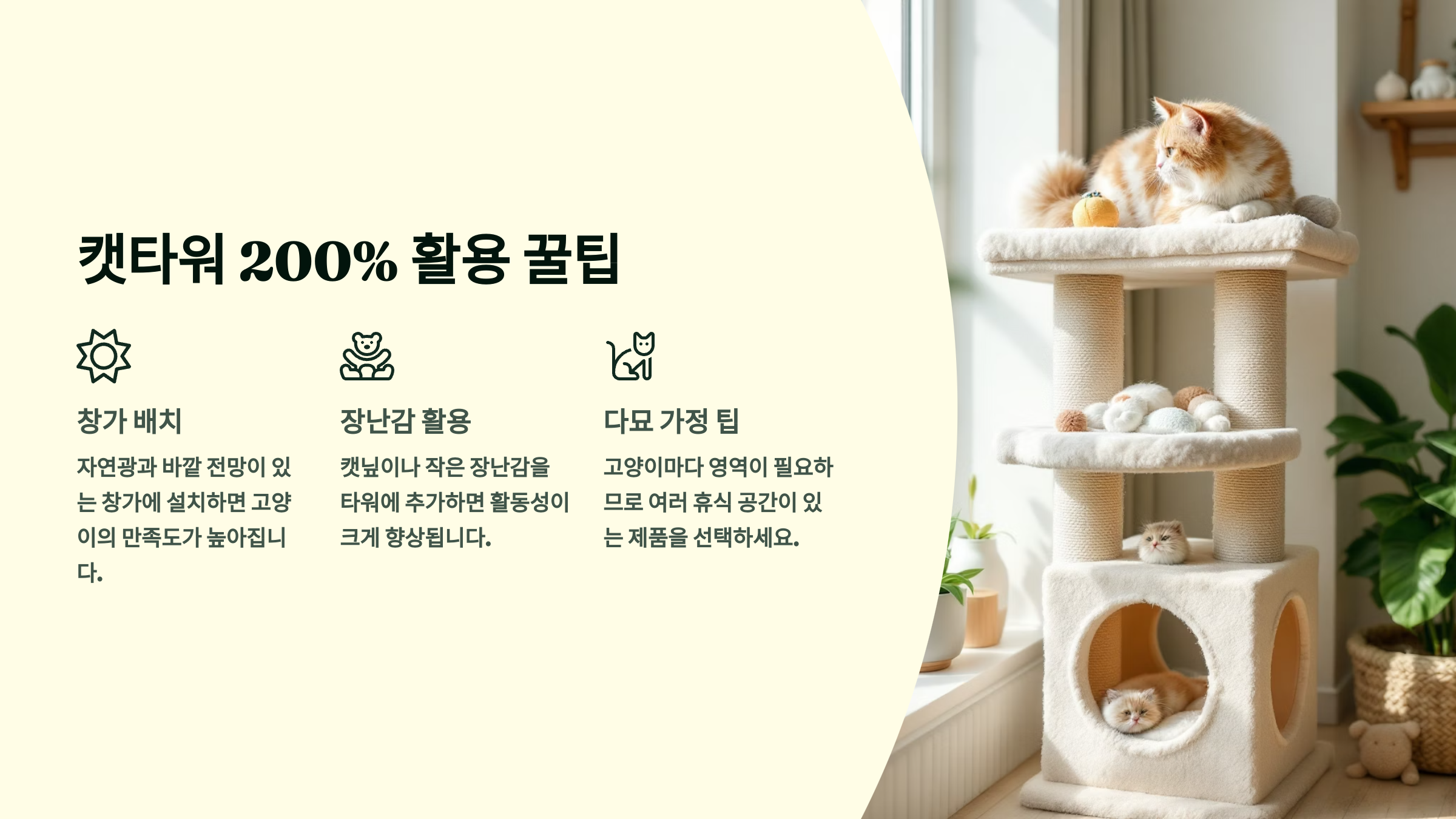 아무리 좋은 캣타워라도 고양이가 안 쓰면 무의미하잖아요? 캣타워를 우리 고양이 전용 놀이터로 만드는 팁을 알려줄게요! 🐈⬛