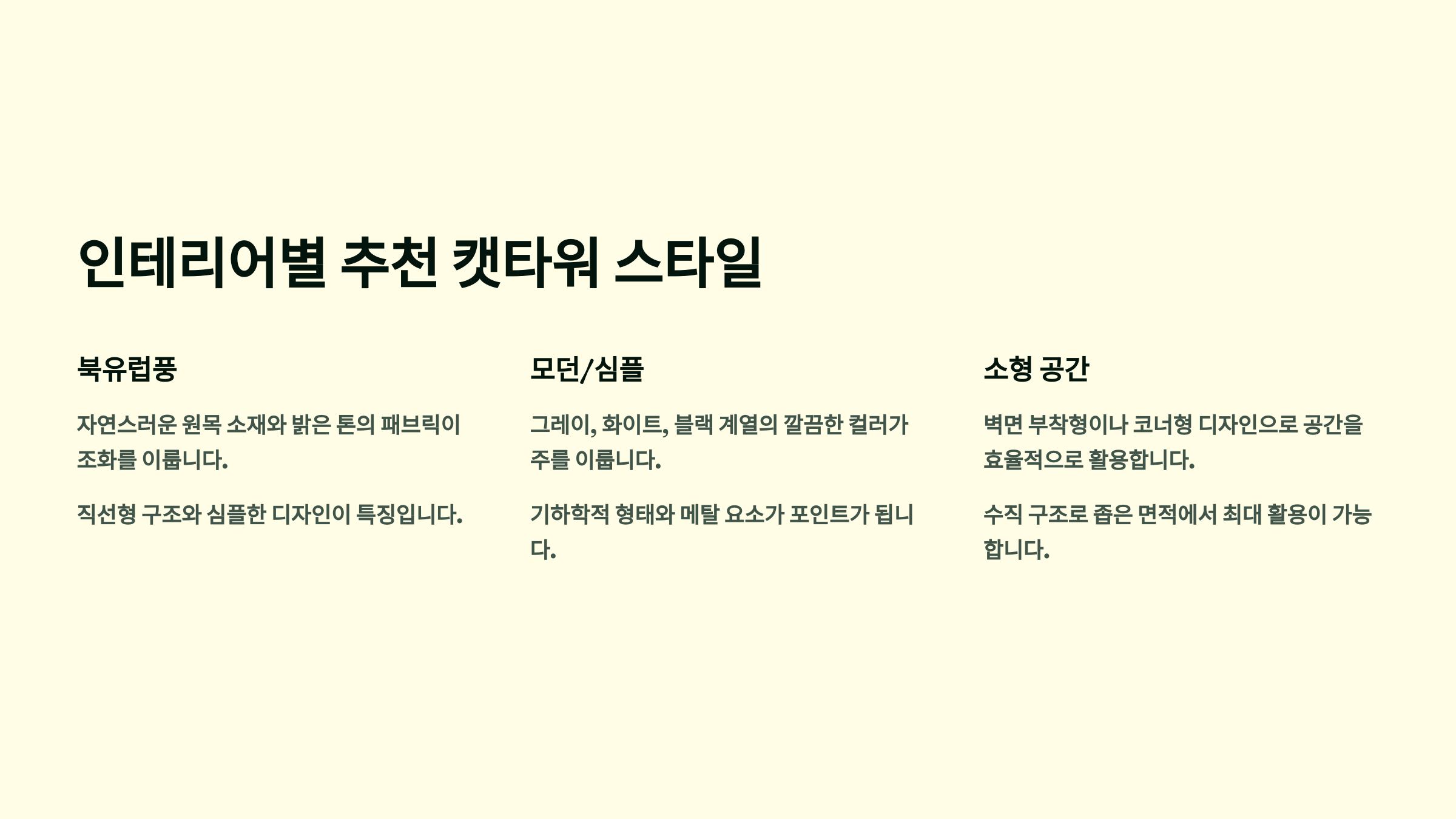 “캣타워 하나만 바꿔도 집 분위기가 확 바뀌어요!” 그래서 많은 집사들이 이제 인테리어 톤에 맞춘 캣타워를 찾고 있죠. 아래 스타일별로 딱 어울리는 캣타워 컨셉을 추천할게요! 🪄