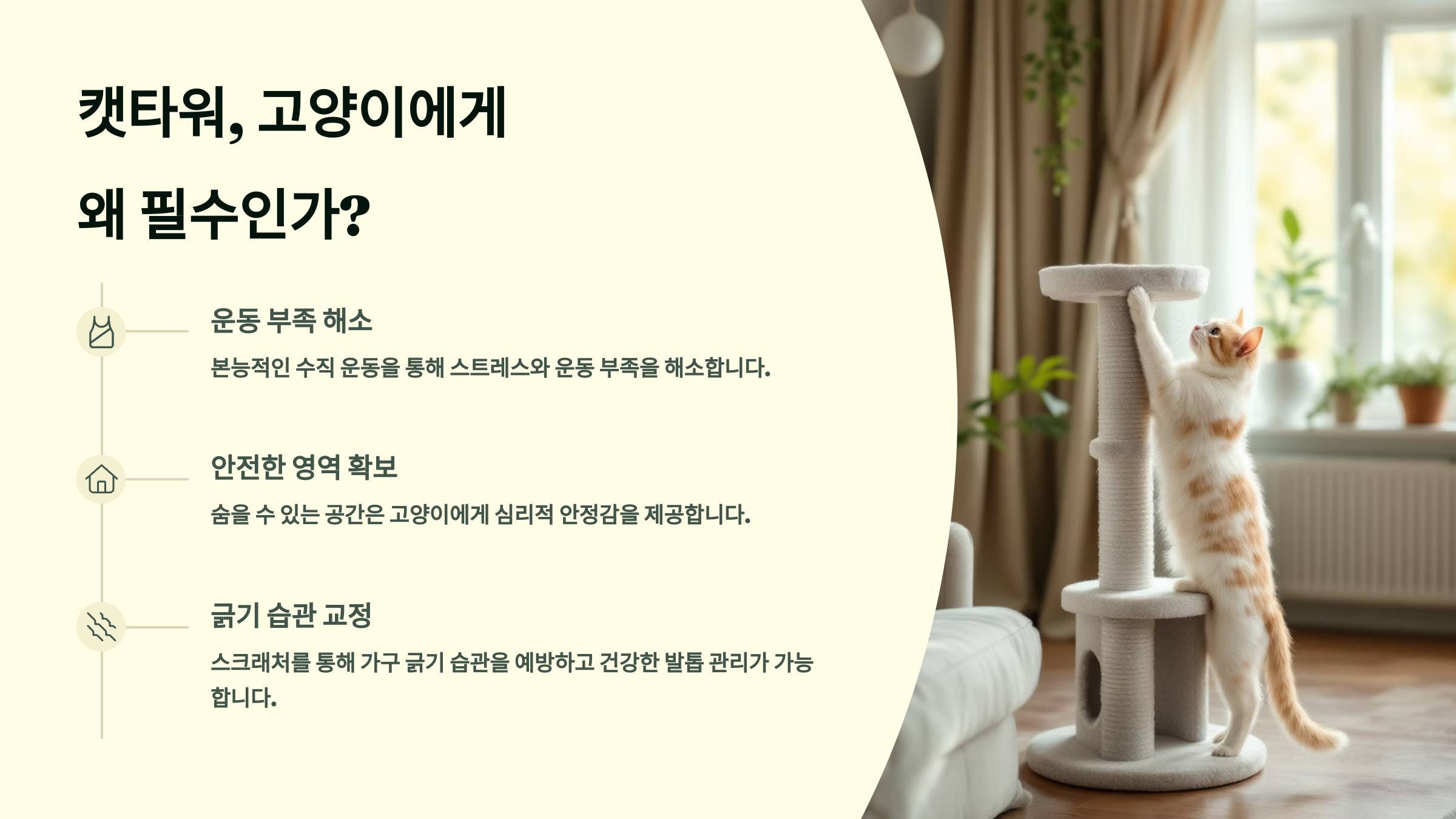A1. 필수는 아니지만, 고양이의 본능(점프, 숨기, 긁기)을 해소해줄 수 있는 공간이라 있으면 훨씬 안정적인 생활을 해요.