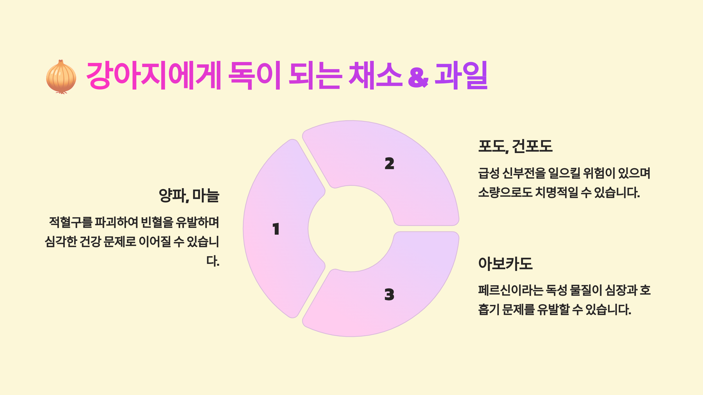 - 🚫 양파 & 마늘: 적혈구를 파괴해 빈혈을 유발할 수 있어요.