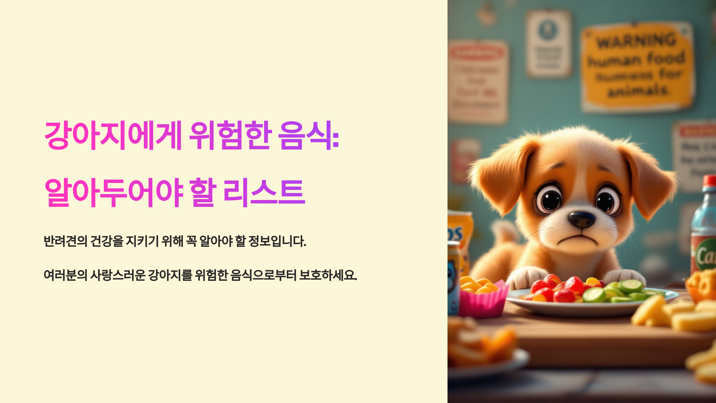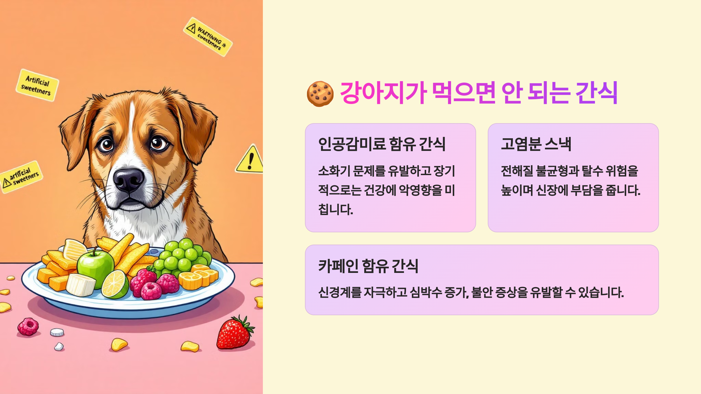 강아지가 간식을 좋아하지만, 사람이 먹는 간식은 대부분 건강에 해로워요! 🐶⚠️