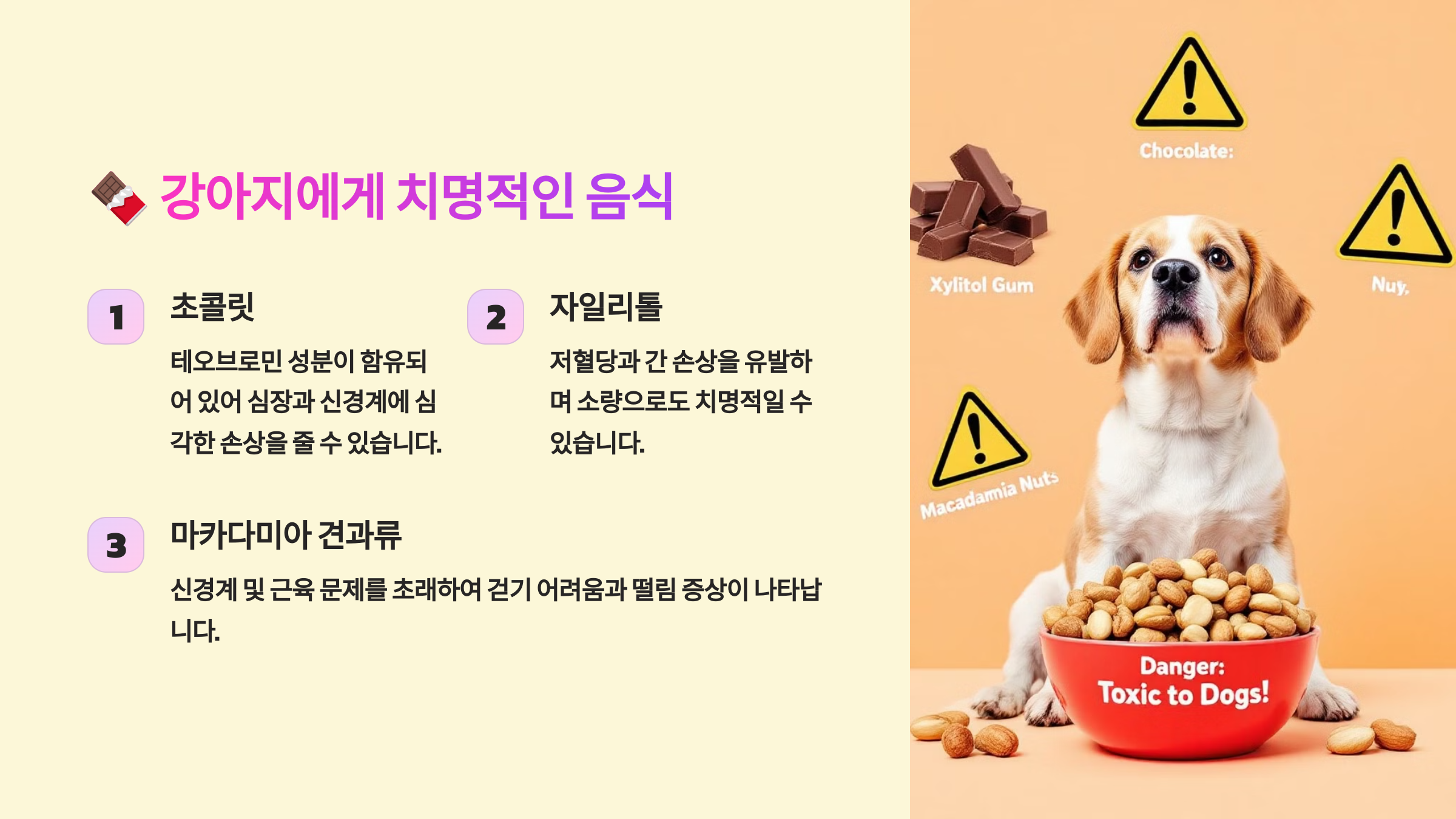 강아지에게는 사람이 먹을 수 있는 음식 중 치명적이거나 해로운 음식이 많아요! 🐶⚠️